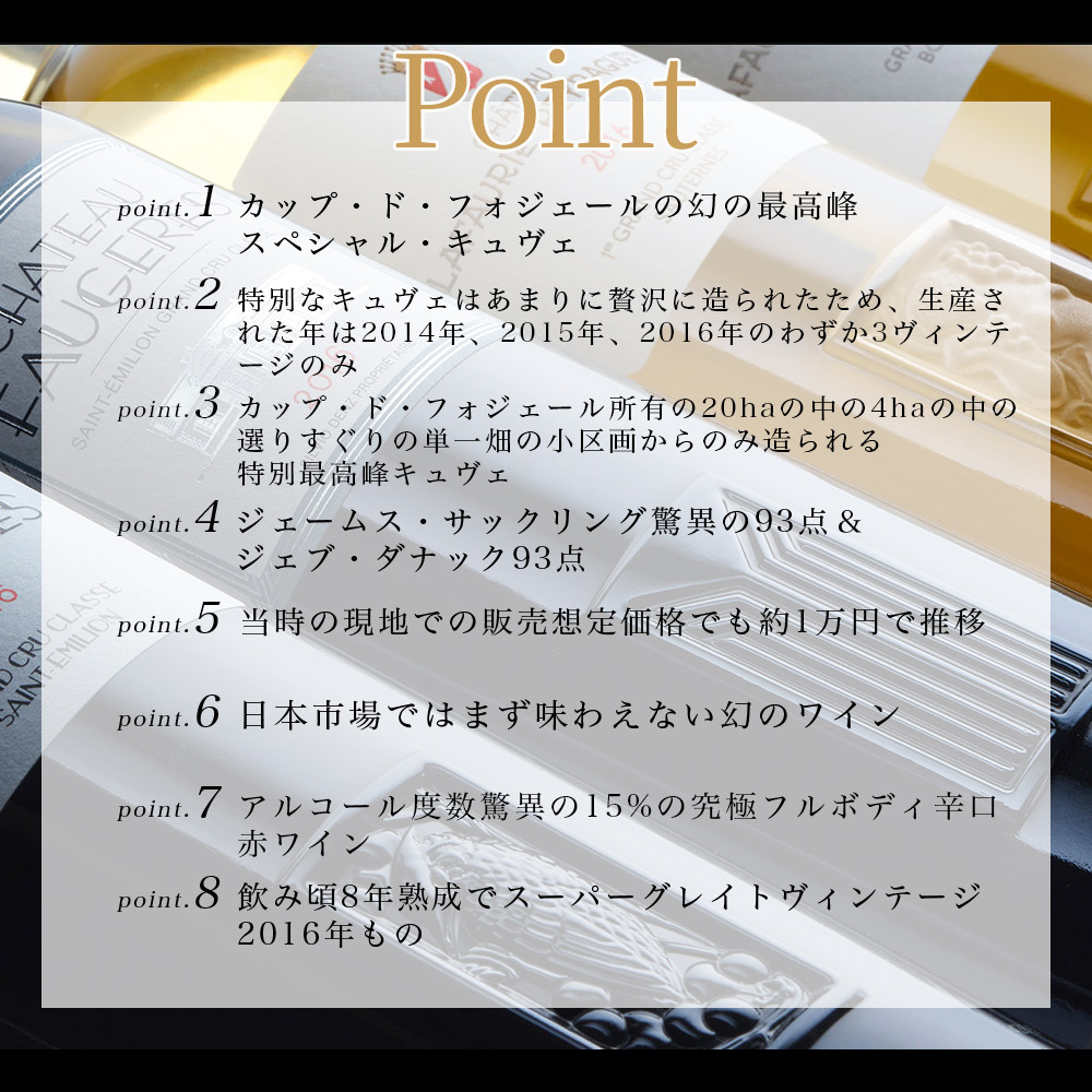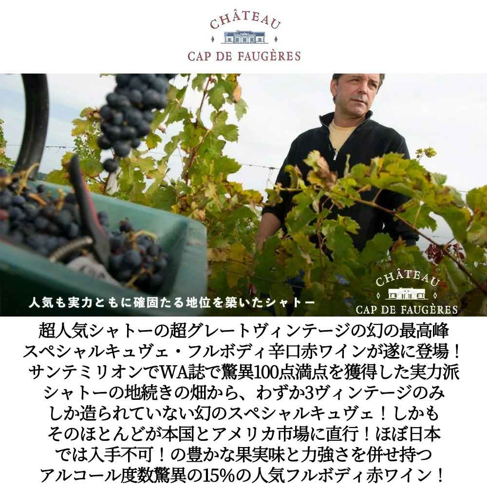【商品説明】入手困難!ボルドー右岸人気急上昇AOC地区から、超人気シャトーの超グレートヴィンテージの幻の最高峰スペシャルキュヴェ・フルボディ辛口赤ワインが遂に登場!サンテミリオンで人気も実力ともに確固たる地位を築いたグラン・クリュのシャトー・フォジェールの地続きのコート・ド・カスティヨンの区画から造られる、豊かな果実味と力強さを併せ持つ人気フルボディ赤ワイン! しかもワインアドヴォケイト誌で驚異100点満点を獲得した実力派シャトーのエッセンスが惜しみなく注がれた、リッチなアロマと凝縮感が魅力のシャトー・カップ・ド・フォジェール! (シャトー・ぺビー・フォジェールの2005年ヴィンテージはワイン・アドヴォケイト誌で100点満点を獲得。さらにシャトー・ぺビー・フォジェールとシャトー・フォジェールの両シャトーはその実力を認められ、2012年にサン・テミリオン特別級に昇格しました。また、彼らと同じ醸造チームが造るこのシャトー・カプ・ド・フォジェールは、有名なワイン評論家ロバート・パーカー氏が「常にカスティヨン・コート・ド・ボルドーのトップレベルである」と称賛しているほどです。) しかもそのシャトー・カップ・ド・フォジェール所有の20haの中の4haの中の選りすぐりの単一畑の小区画からのみ造られる特別最高峰キュヴェ ! (粘土石灰質土壌の斜面の畑からの古木の葡萄を木樽発酵&オーク樽14ケ月熟成&ノンコラージュ) がこのカップ・ド・フォジェール“ラ・ムーレール”!しかもそのほとんどがアメリカ市場に直行! (当時の現地での販売想定価格でも約1万円) しかもこの特別なキュヴェはあまりに贅沢に造られたため、生産されたヴィンテージはわずか2014年、2015年、2016年のわずか3ヴィンテージのみと言うまさに幻の特別キュヴェ!しかも大人気で待望の超スーパーグレイトヴィンテージ2016年! (しかもWAでもサンテミリオンに過去最高の96点!RVF誌2025年版ではボルドー赤の2016年に99点をつける偉大なヴィンテージ!) ( (2016年は、ボルドー全域で素晴らしい天候に恵まれた歴史的ヴィンテージ!) 厳しい評価で知られるRVF誌をして、「フルーティで親しみやすい濃厚さが際立つコート・ド・カスティヨン」と評価されている人気シャトー!AOCサンテミリオン特級のフォジェールより、フルーティで親しみやすく、濃厚さが際立つと言われるカップ・ド・フォジェール!) そのカップ・ド・フォジェールの最高のテロワールと古樹の葡萄の木から生産された最高のものだけを厳選して造られた、まさに最高峰キュヴェ!ワイン評論家の評価も高く『スイス人のシルヴィオ・デンツは、キャップ・ド・フォジェールの単一畑のワインを特に誇りに思っている。この豪奢なボルドーワインのブドウは、小さな区画から供給されている。言うまでもなく、2016年は偉大な年だった。』 ジェームス・サックリングで驚異の93点の高評価!絶賛コメントは『熟したダークプラムの豊かな香りと新鮮な土のスジがあり、アロマティックで透明感のある良いノーズを持つ。味わいには魅力的な深みと存在感があり、熟したダーク・プラムの風味が長く続く。2022年から試してみよう。93点』と大注目! ジェフ・リーヴ、ザ・ワインセラー・インサイダーでも驚異の92点獲得!絶賛コメントは『「濃縮感があり、甘く、みずみずしく、リコリス、エスプレッソ、ブラックチェリーの香りと味わいがある。古樹のメルロ80%、カベルネ・フラン20%のブレンドで造られている。92点」』と絶賛! ジェブ・ダナックでも驚異の93点の高評価!大絶賛コメントは『石灰質土壌の4ヘクタールの小さな区画から造られ、メルロ80%とカベルネ・フラン20%のブレンドで造られる2016年のシャトー・キャップ・ド・フォジェール・ラ・ムーレールは、より深い色調で、黒と青の果実、白トリュフ、黒鉛、砕けた岩のロックスターのようなブーケを誇る。この美しくテクスチャーのある層状のミディアムからフルボディの美酒は、熟したタンニンと素晴らしいフィニッシュを持ち、ボルドーの口当たりの良いワインである。今後15年以上かけて飲もう。-2034年 93点』とこれまた大絶賛! 超人気シャトーの超グレートヴィンテージの幻の最高峰スペシャルキュヴェ!しかも日本ではほぼ入手不可のスペシャルキュヴェ!しかも2014、2015、2016年の3ヴィンテージのみしか世に存在しない、まさにワイン愛好家垂涎の逸品が重厚ボトルで偉大なヴィンテージで限定入荷! (ちなみにアメリカ市場でもほぼ売り切れていますが、ワインサーチャーで2024年12月現在37.39ドル (約5,608円-で推移しています。) )