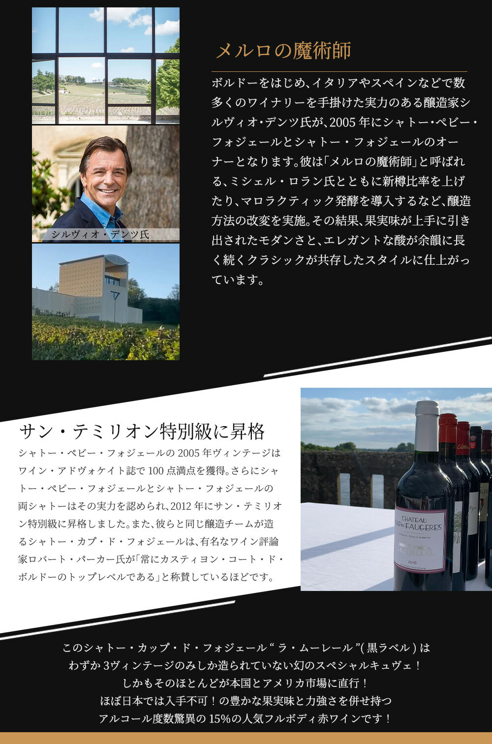 【商品名】シャトー・カップ・ド・フォジェール・“ラ・ムーレール”(黒ラベル)[2016]年・シャトー・カップ・ド・フォジェールの単一畑の小区画からの幻の特別キュヴェ・AOCカスティヨン・コート・ド・ボルドー・木樽発酵&オーク樽14ケ月熟成・(ミッシェル・ローラン&ステファン・フォン・ナイペルグ伯爵コンサルタント)・アルコール度数驚異の15%・ジェイムスサックリング驚異の93点&ジェブ・ダナック驚異の93点&ジェフ・リーヴ92点獲得・重厚ボトル・幻の最終キュヴェ!【英名】Chateau Cap de Faugeres 'La Mouleyre' 2016 Chateau Faugeres AOC Castillon Cotes de Bordeaux