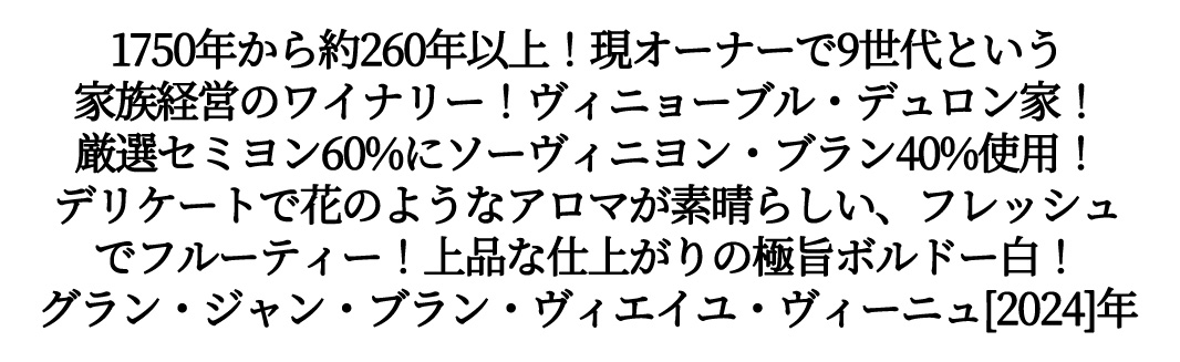 【商品説明】フランス・ボルドー・辛口白ワイン愛好家大注目!AOCボルドーの規格をクリアーしたお買い得!ボルドー辛口白ワイン!しかもジルベール&ガイヤール2025金賞受賞ワイン!しかも造り手は、1750年から約260年以上!現オーナーで9世代という家族経営のワイナリーのヴィニョーブル・デュロン家のシャトー元詰ワイン!粘土石灰質土壌の平均樹齢25年のサステナブル農法の古樹V.Vの厳選セミヨン60%にソーヴィニヨン・ブラン40%をステンレスタンクにて4カ月シュール・リー熟成で造られる極旨ボルドー辛口白ワイン!色調は美しく透明感のある淡い黄色!デリケートで花のようなアロマが素晴らしい、フレッシュでフルーティな辛口白ワイン!上品な仕上がりの極旨ボルドー・ブランが限定で少量入荷!