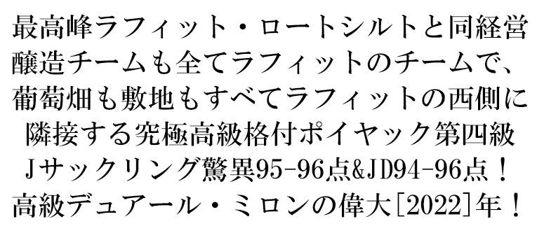 【商品名】シャトー デュアール ミロン ロートシルト 2022 AOCポイヤック メドック グラン クリュ クラッセ 公式格付第四級 赤 辛口 フルボディ 【英名】CHATEAU Duhart-Milon Rothschild 2022 AOC Pauillac (Grand Cru Classe du Medoc en 1855) 【商品説明】高級ボルドー メドック格付フルボディ辛口赤ワイン愛好家大注目!ポイヤック格付赤ワイン愛好家大注目!あのボルドー最高峰のひとつ!メドック格付第一級!最高峰!5大シャトーの筆頭シャトー!シャトー・ラフィット・ロートシルトと同経営!(ロートシルト家(ラフィット)による)であり、醸造チームも全てラフィット・ロートシルトのチームであり、葡萄畑も敷地もすべてラフィット・ロートシルトの西側に隣接する究極格付ポイヤック第四級!“デュアール・ミロン・ロートシルト”!しかも大人気スーパーグレイトヴィンテージ!(アシェット・ガイド誌2025年版ではボルドーの赤に19/20点の偉大なヴィンテージで過去60年間で唯一この2022年のみの過去最高スーパーグレイトVT)(ワインアドヴォケイト誌もサンジュリアン、ポイヤック、サンテステフ、マルゴーに驚異の95点を付けるスーパーグレイトヴィンテージ)!しかもロバート・パーカー氏は★★★★4つ星生産者に挙げ、「格付三級に昇格させてもよいかも知れない」と絶賛!このスーパーグレイト2022年でジェームス・サックリング驚異の95-96点でコメントは「ブラックカラント、ダークチョコレート、クルミの殻の特徴が非常にポイヤック的。フルボディでありながらコンパクト。湿った土、マッシュルーム、土、黒タバコ。繊細で力強いタンニン。フレッシュで複雑。カベルネ・ソーヴィニヨン78%、メルロー22%。」!さらにジェブ・ダナック94-96点でコメントは「グラン・ヴァン2022シャトー・デュアール=ミロンは、カベルネ・ソーヴィニヨン78%、メルロ22%。鉛筆、黒鉛、タバコ、赤と黒の果実のアロマは、古典的なポイヤックらしさだけでなく、より豊かさをもたらす。華やかなリッチさ、ミディアムからフルボディの口当たり、素晴らしいフィニッシュを持つ、この全くクラシックで隙のないバランスの取れたポイヤックは、読者に手に取ってもらえるはずだ。」と高評価!ブラックベリーやミルクチョコレートにスパイスのニュアンス!ゴージャスで口中を長く愛撫するシルキーなタンニンと長い余韻!人気も品質も急上昇!の本格派格付!究極デュアール・ミロンのスーパーグレイトヴィンテージ[2022]年ものが限定で極少量入荷! 【タイプ】赤・辛口 【テイスト】フルボディ 【生産年】2022 【生産者】ドーメーヌ・バロン・ド・ロートシルト (ラフィット) シャトー・ラフィット・ロートシルト 【生産地】フランス/ボルドー/メドック/ポイヤック村 AOCポイヤック(メドック格付第4級) 【品種/セパージュ アッサンブラージュ】カベルネ・ソーヴィニヨン78%、メルロ22% 【内容量】750ml 【JANコード】0101181006307