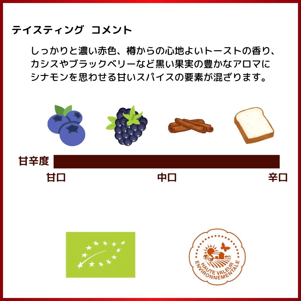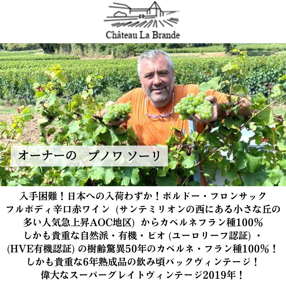 【商品説明】入手困難!日本への入荷わずか!ボルドー・人気上昇限定地域AOCフロンサック・フルボディ辛口赤ワイン (サンテミリオンの西にある小さな丘の多い人気急上昇AOC地区) 愛好家大注目!カベルネフラン種100%フルボディ辛口赤ワイン愛好家垂涎!しかも貴重な自然派・有機・ビオ (ユーロリーフ認証) ・ (HVE有機認証) の樹齢驚異50年のカベルネ・フラン種100%!しかも貴重なしかも貴重な6年熟成品の飲み頃バックヴィンテージ[2019]年!しかもグレイトヴィンテージ2019年! (ちなみに、ワインアドヴォケート誌のヴィンテージチャート評価では、2019年のポムロールに驚異の96点&サンテミリオンに95点という高得点=スーパーグレイトヴィンテージ評価) !しかもボルドーの伝統に縛られずに単一品種の個性を表現した造り手の最上級品!フロンサックAOCと言えば、ワイン評論家のヒュー・ジョンソン氏は★★-★★★3つ星をつけ「サンテミリオンAOCの西にある小さな丘の多いAOC区域、ボルドーで最もお値打ちの赤のひとつ!」と絶賛!しかもボルドー右岸の隠れた銘醸地フロンサック (イル川を挟んで銘醸地ポムロールの対岸にある銘醸産地) の中でも最も古い畑!しかも有機栽培 (ビオ・ (ユーロリーフ認証) (HVE有機認証) ) 樹齢驚異の50年のカベルネフラン種100%!フレンチオーク樽100% (新樽&1年樽) で驚異の24ヶ月熟成 (畑は粘土石灰質土壌の南向きの斜面にあり、平均樹齢は50年以上です。除梗後、26度に温度コントロールしたコンクリートタンクで約20日間発酵させます。熟成はフレンチオーク樽(新樽と1回使用樽)で24ヶ月行います。) 単一品種の個性を表現して造るシャトー ラ ブランドの最上級品。畑は南向きの斜面、粘土石灰質土壌です。レゼルヴに使用するカベルネ フランの平均樹齢は50年以上です。収穫した葡萄は除梗します。発酵は26度に温度コントロールされたコンクリートタンクで約20日間行います。熟成はフレンチオーク樽(新樽と1回使用樽)で驚異の24ヶ月熟成を行います。しっかりと濃い赤色、樽からの心地よいトーストの香り、カシスやブラックベリーなど黒い果実の豊かなアロマにシナモンを思わせる甘いスパイスの要素が混ざります。口に含むと程よいボディがあり、タンニンはこなれていて、とても調和のとれたフィニッシュです。しかも日本への入荷わずか!で限定少量入荷!