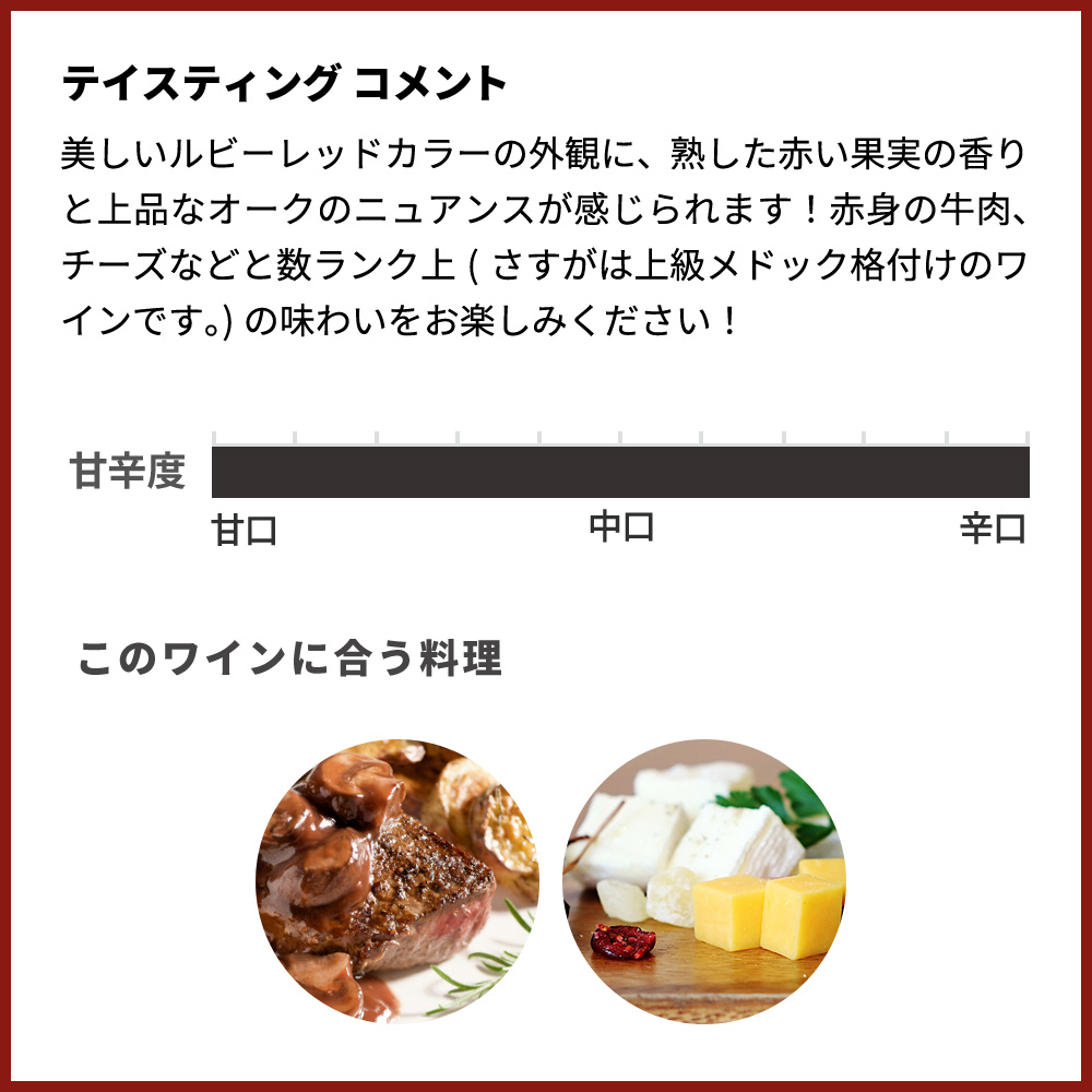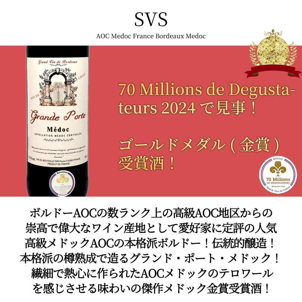 【商品説明】ボルドー・メドック辛口フルボディ赤ワイン愛好家大注目!高級メドック愛好家大注目!ボルドーAOCの数ランク上の高級AOC地区からの崇高で偉大なワイン産地として定評!人気高級メドックAOC!しかもスーパーグレイトヴィンテージ[2019]年(アシェット・ガイド誌2024年版でボルドーの赤ワインに18/20点&RVF誌2024年版でも驚異の97点の高評価!)の飲み頃6年熟成作品! このワイン、グランド・ポート・メドック[2019]年で70 Millions de Degustateurs 2024で見事!ゴールドメダル(金賞)受賞酒! 粘土石灰質土壌からのカベルネソーヴィニヨン種50%にメルロー種50%をオーク樽5ヶ月熟成で造られる王道メドック!美しいルビーレッドカラーの外観に、熟した赤い果実の香りと上品なオークのニュアンスが感じられます! やわらかい口当たりにしっかりとした果実味とタンニンが特徴的な味わいの人気辛口赤ワインがしかもスーパーグレイトヴィンテージ2019年で、しかも金賞受賞酒で限定入荷!赤身の牛肉、チーズなどと数ランク上(さすがは上級メドック格付けのワインです。)の味わいをお楽しみください!