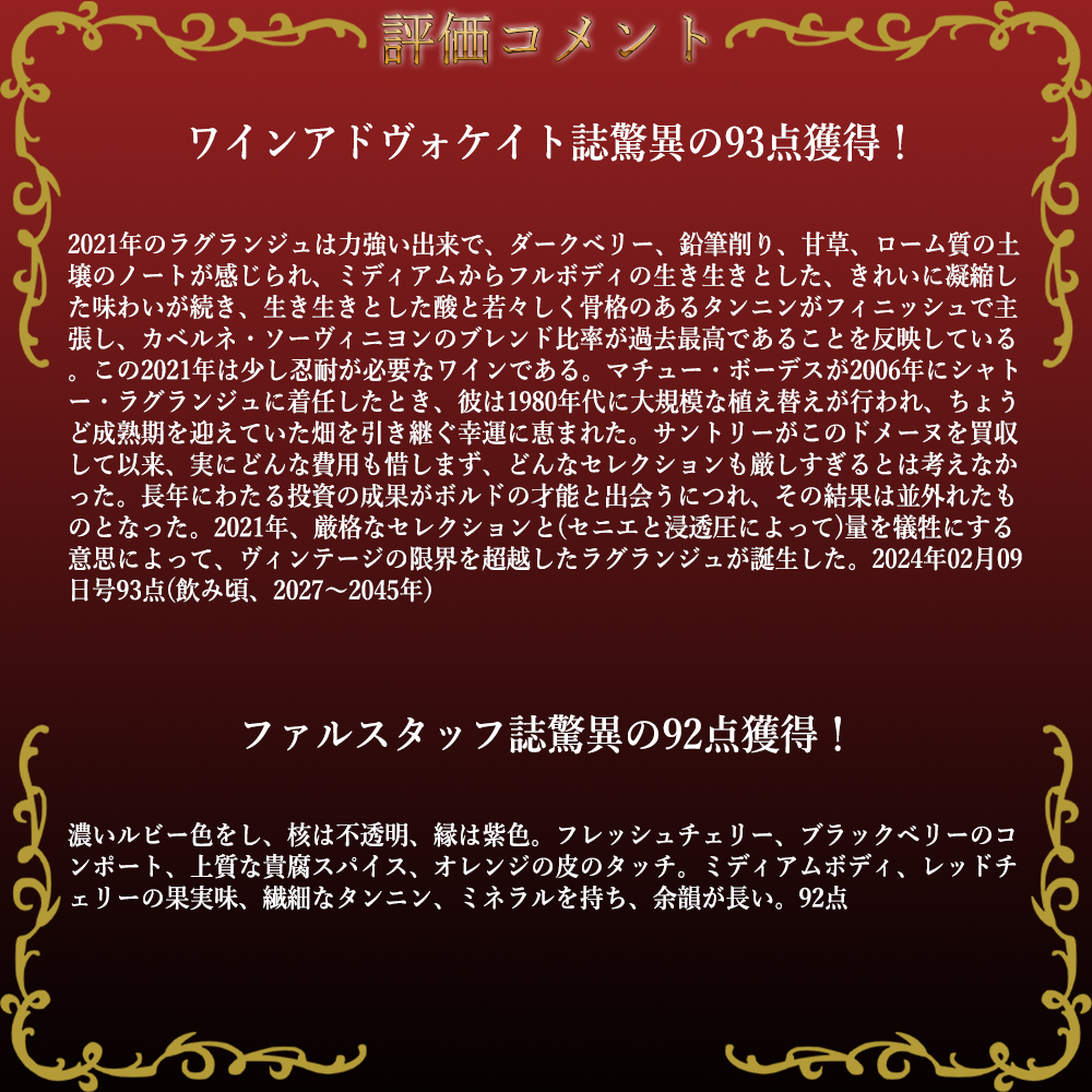 【商品名】【ハーフサイズ】シャトー・ラグランジュ[2021]年メドック・グラン・クリュ・クラッセ・公式格付第三級・AOCサン・ジュリアン・シャトー元詰・(醸造コンサルタント、エリック・ボワスノ)・フレンチオーク樽100%&約21ヶ月熟成・ワインアドヴォケイト誌驚異の93点(2027~2045)&デカンタ誌驚異の92点&ジェームス・サックリング驚異の92点獲得・希少ハーフサイズ(375ml)