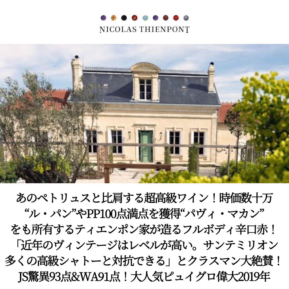 【商品説明】ボルドー人気急上昇AOCフルボディ赤ワイン愛好家大注目!人気急上昇AOC地区コート・ド・ボルドー・フランから人気急上昇ワイン!しかもスーパーグレイトヴィンテージ[2019]年 (アシェット・ガイド誌2023年版がボルドーの赤に18/20点を付け、『レヴュ・ド・ヴァン・ド・フランス2023年版』でも驚異の97点を付け、ワインアドヴォケイト誌もサンテミリオンに驚異の95点を付けるスーパーグレイトヴィンテージ[2019]年) の飲み頃6年熟成作品! 造り手は、あのペトリュスと比肩する超高級ワイン!時価数十万“ル・パン”やPP100点満点を獲得した“パヴィ・マカン”をも所有するティエンポン家!あの「神の雫」でも2001年ヴィンテージが、「柔らかくて優しくてどこか切ない甘酸っぱさ。まるでセピア色の思い出みたいなノスタルジーが溢れている気がする」と紹介!超人気ピュイグロー!ロバート・パーカー3つ星★★★生産者! このグレイト2019年でも、ジェームス・サックリング驚異の93点高評価でコメントは「フレッシュなダークフルーツとブルーフルーツのアロマが広がり、ベーキングスパイス、チョコレート、砕いた岩のニュアンスもある。フルボディでコンパクト、しっかりと洗練されたタンニンと美味しくジューシーな果実味。洗練されたしっかりとしたフィニッシュ。メルロ86%、カベルネ・フラン14%。」! さらにデカンタ誌92点でコメントは「香ばしいミルクチョコレートとブラックチェリーの華やかな香り。口に含むと、ブルーベリー、ラズベリー、ブラックカラントなどの新鮮な果実味と、ミントのような石のような苦味がほのかに感じられ、果実味を縁取るようにテクスチャーとタンニンを与える。まろやかでシルキーなタンニン。飲みやすく、お勧めできる。」! ワインアドヴォケイト誌91点でコメントは「2019年のピュイゲローは、ブラックチェリー、スミレ、アイリス、タイム、メントール、スパイスのタッチのアロマを示す。味わいはミディアムからフルボディで、ジューシーかつ力強く、プラムとカシスの繊細なアロマが感じられる。このヴィンテージは、たとえ3~5年の熟成を経たとしても、楽しみながら飲むことができる。」! ヒュー・ジョンソン氏をして「樽で熟成させたワインは驚くほど優秀」と言わしめ、厳しい評価で知られるル・クラスマン誌 (現レ・メイユール・ヴァン・ド・フランス誌) には「近年のヴィンテージはレベルが高い。サンテミリオンの多くの高級シャトーと対抗できる」と大絶賛! メルロ主体 (86%) にカベルネ・フラン14%を収量約35hl/haの低収量で収穫!オーク樽で驚異の12~16ヶ月熟成で造られる右岸ボルドーファン要チェックの大人気フルボディ辛口赤ワインが飲み頃6年熟成でグレイトヴィンテージ[2019]年で限定少量入荷!