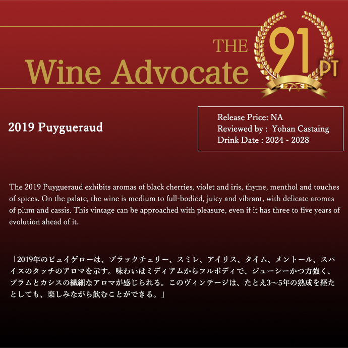 シャトー ピュイゲロー (ピュイグロー) 2019 ニコラ ティエンポン家元詰 赤 フルボディ ジェームス サックリング驚異の93点 Chateau Puygueraud 2019 AOC Francs Cotes de Bordeaux