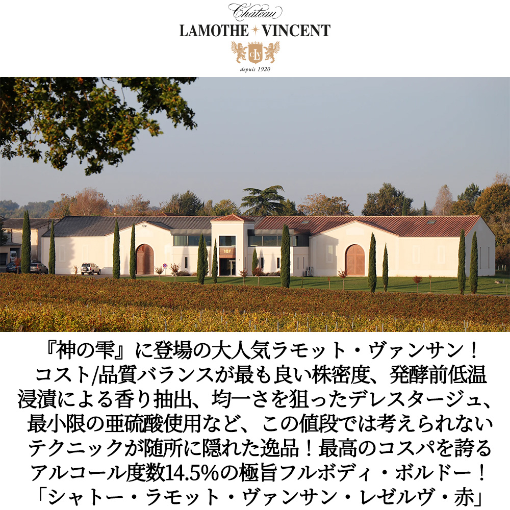 シャトー ラモット ヴァンサン レゼルヴ 赤 2022 ヴァンサン家元詰 AOCボルドー 赤 辛口 フルボディ 750ml Chateau Lamothe Vincent Reserve Rouge 2022 Vignobles Vincent