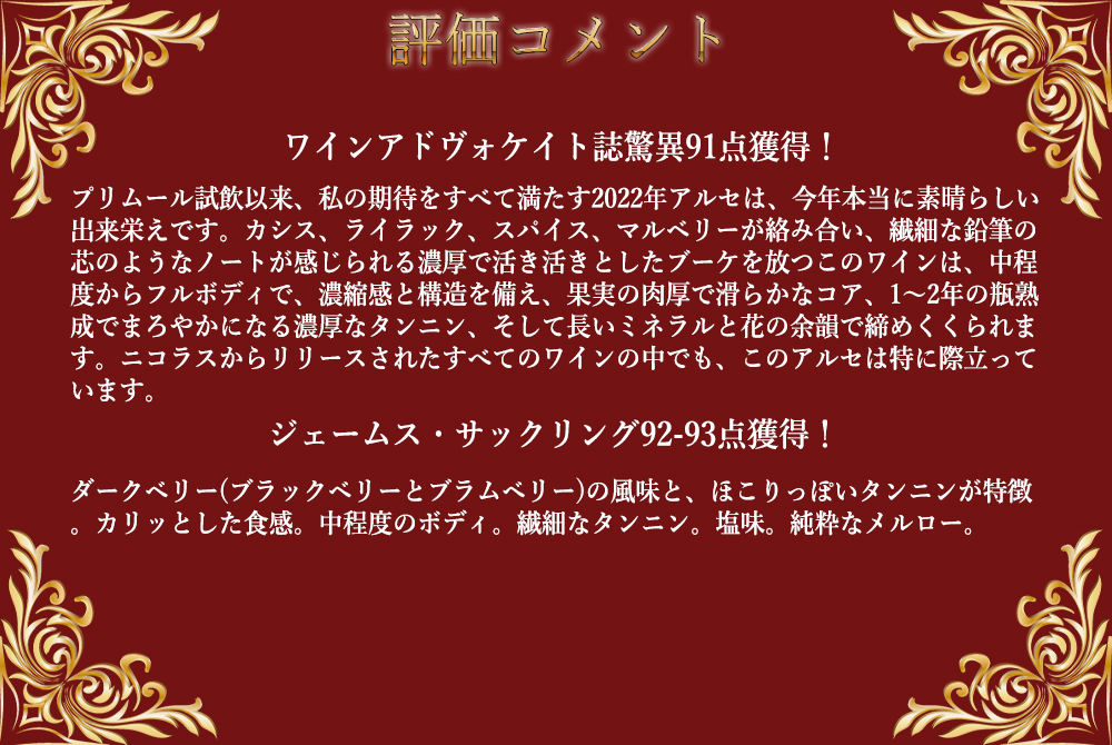 【商品説明】高級サンテミリオン・フルボディ辛口赤ワイン愛好家大注目!高級カスティヨン愛好家大注目!しかも高評価スーパーグレイトヴィンテージ[2022]年もの(ワインアドヴォケイト誌ヴィンテージチャートでもポムロールに95点、サンテミリオンに95点をつけるスーパーグレイトヴィンテージ2022年)! 造り手は、ロバート・パーカー満点★★★★★5つ星生産者で、「このシャトーは現在サンテミリオンのスターのひとつ」と絶賛!ベタンヌ&ドゥソーヴでも4B&Dマークをつけ「パヴィ・マカンのワインは、とてもボディーがしっかりしていて肉付きが良く、ヴィンテージを重ねるごとにフィネスと調和が増し、パヴィのこの区画に固有の比類なきトリュフの風味とミネラルの張りも現れている。このクリュの成功は2名の人物の完璧な仕事を有名にした。」と大絶賛!されたあのサンテミリオン銘醸シャトーである高級パヴィ・マカン所有のニコラ・ティエンポン氏が手掛ける究極カスティヨン・コート・ド・ボルドー! 2022年は粘土石灰質土壌の畑からのメルロー驚異の100%をフレンチオーク樽12~16ヶ月 (225L、新樽比率50%) で造られるアルコール度数14.5%のフルボディ辛口赤ワイン! この[2022]年でワインアドヴォケイト誌驚異91点でコメントは「プリムール試飲以来、私の期待をすべて満たす2022年アルセは、今年本当に素晴らしい出来栄えです。カシス、ライラック、スパイス、マルベリーが絡み合い、繊細な鉛筆の芯のようなノートが感じられる濃厚で活き活きとしたブーケを放つこのワインは、中程度からフルボディで、濃縮感と構造を備え、果実の肉厚で滑らかなコア、1~2年の瓶熟成でまろやかになる濃厚なタンニン、そして長いミネラルと花の余韻で締めくくられます。ニコラスからリリースされたすべてのワインの中でも、このアルセは特に際立っています。」! ジェームス・サックリング92-93点でコメントは「ダークベリー(ブラックベリーとブラムベリー)の風味と、ほこりっぽいタンニンが特徴。カリッとした食感。中程度のボディ。繊細なタンニン。塩味。純粋なメルロー。」と大注目! 豊かなベリーのアロマと品の良い果実味はさすがの一言!ニコラ・ティエンポン氏渾身の究極カスティヨン“シャトー・アルセ”の高評価スーパーグレイトヴィンテージ[2022]年が限定で少量入荷!