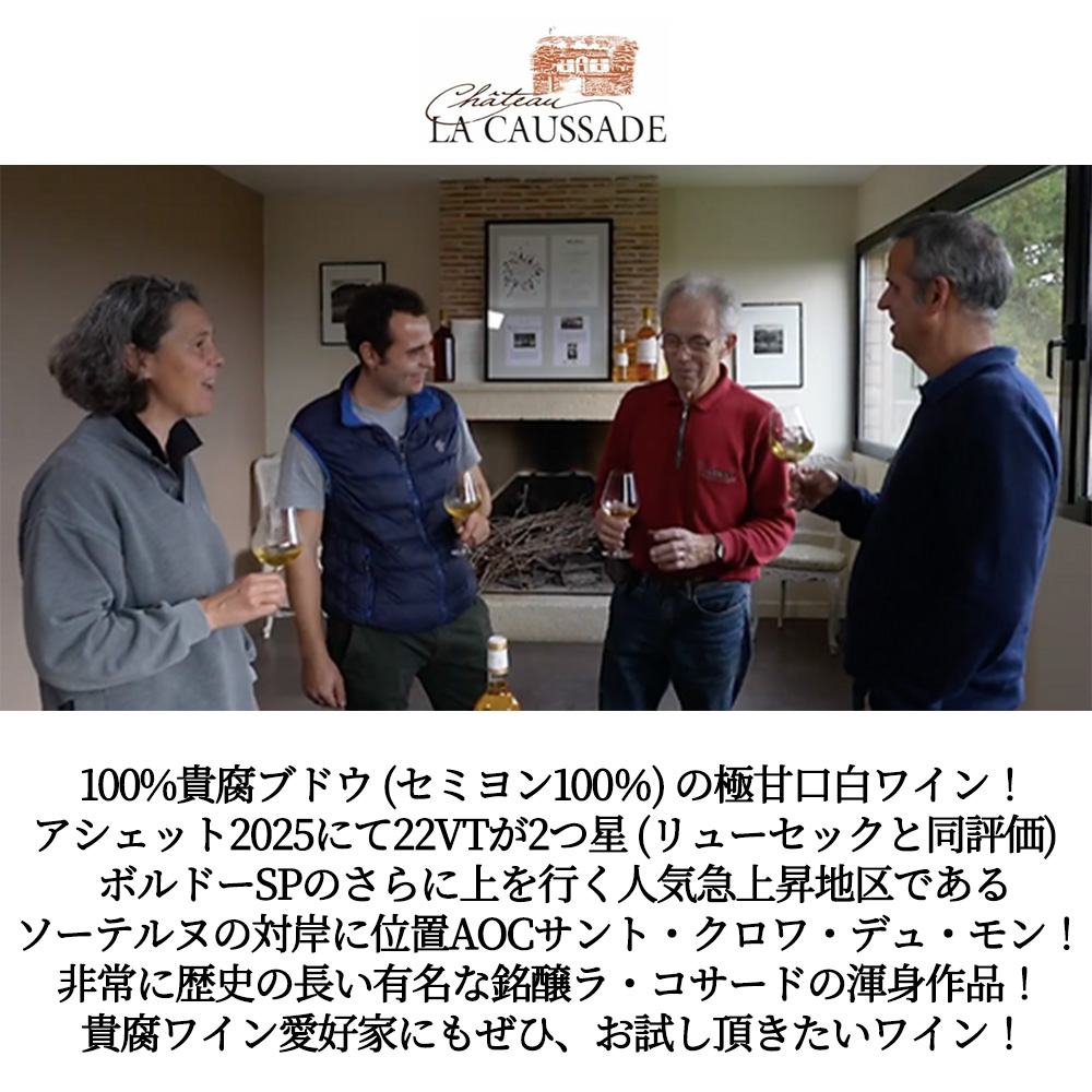 【商品名】シャトー・ラ・コサード[2022]年・シャトー元詰(アルマンド家)・セミヨン種100%・A.O.Cサント・クロワ・デュ・モン<白・極甘口>・100%貴腐ブドウを使用・アシェット2025にて22VTが2つ星(リューセックと同評価)&コンクール・ド・ボルドー・2023金賞受賞【英名】Chateau La Caussade 2022 A.O.C Sainte Croix Du Mont
