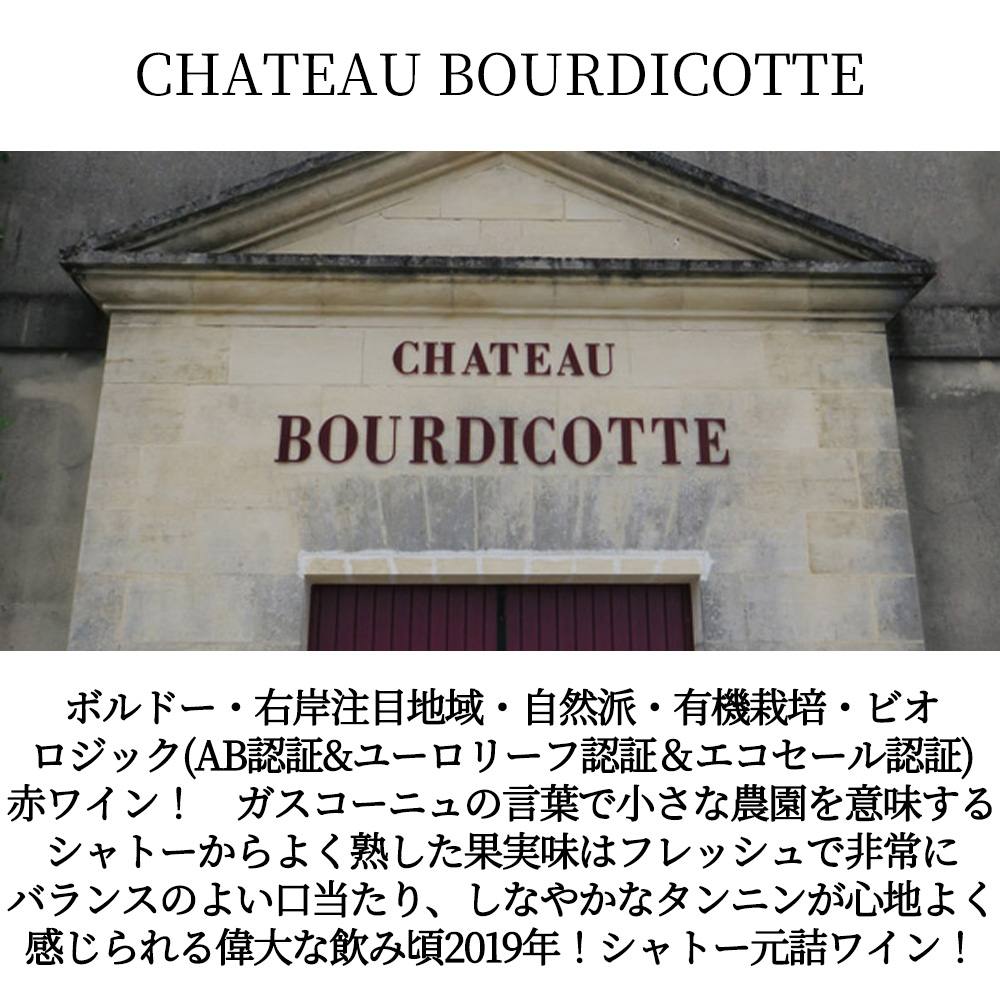 【商品名】シャトー・ブルディコット・キュヴェ・レ・テール・ルージュ[2019]年・シャトー元詰(「ブルディコット」はガスコーニュの言葉で小さな農園の意味)・有機栽培・ビオロジック(AB認証&ユーロリーフ認証&エコセール認証)・平均樹齢は35年・18ケ月熟成・AOC ボルドー・シュペリュール・稲葉輸入品