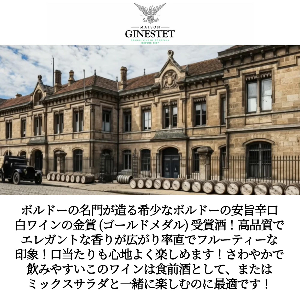 【商品説明】高級ボルドー・セック・辛口白ワイン愛好家大注目!希少なボルドーの辛口白の金賞 (ゴールドメダル) 受賞酒 ( ジルベール&ガイヤール 2025年度) !しかもお買い得価格のボルドーのゴールドメダル受賞酒! しかも造り手はフランスワインの業界の最大手!ボルドーの名門!グリュオー・ラローズやシャトー・シャス・スプリーン、フェリエール、シトランなどの人気格付シャトーを多数所有していることで知られる1897年にネゴシアンであるフェルナンド・ジネステによって設立されたジネステ社! (タイヤン・グループ(メルロー家)の一員となり、現在はその中核を担っています。) によるボルドー・ブラン・セックAOP! ソーヴィニヨンブラン種主体とセミヨン種他で造られるこの白ワインは、輝きのある澄んだ色合いに銀色のニュアンスが感じられます!高品質でエレガントな香りが広がり率直でフルーティーな印象!口当たりも心地よく楽しめます!さわやかで飲みやすいこのワインは食前酒として、またはミックスサラダと一緒に楽しむのに最適です!適温8-10度!アロマティックな余韻も特徴的な究極辛口白ワイン!がインポーターさんとの協賛価格で超お値打ち価格でご案内!