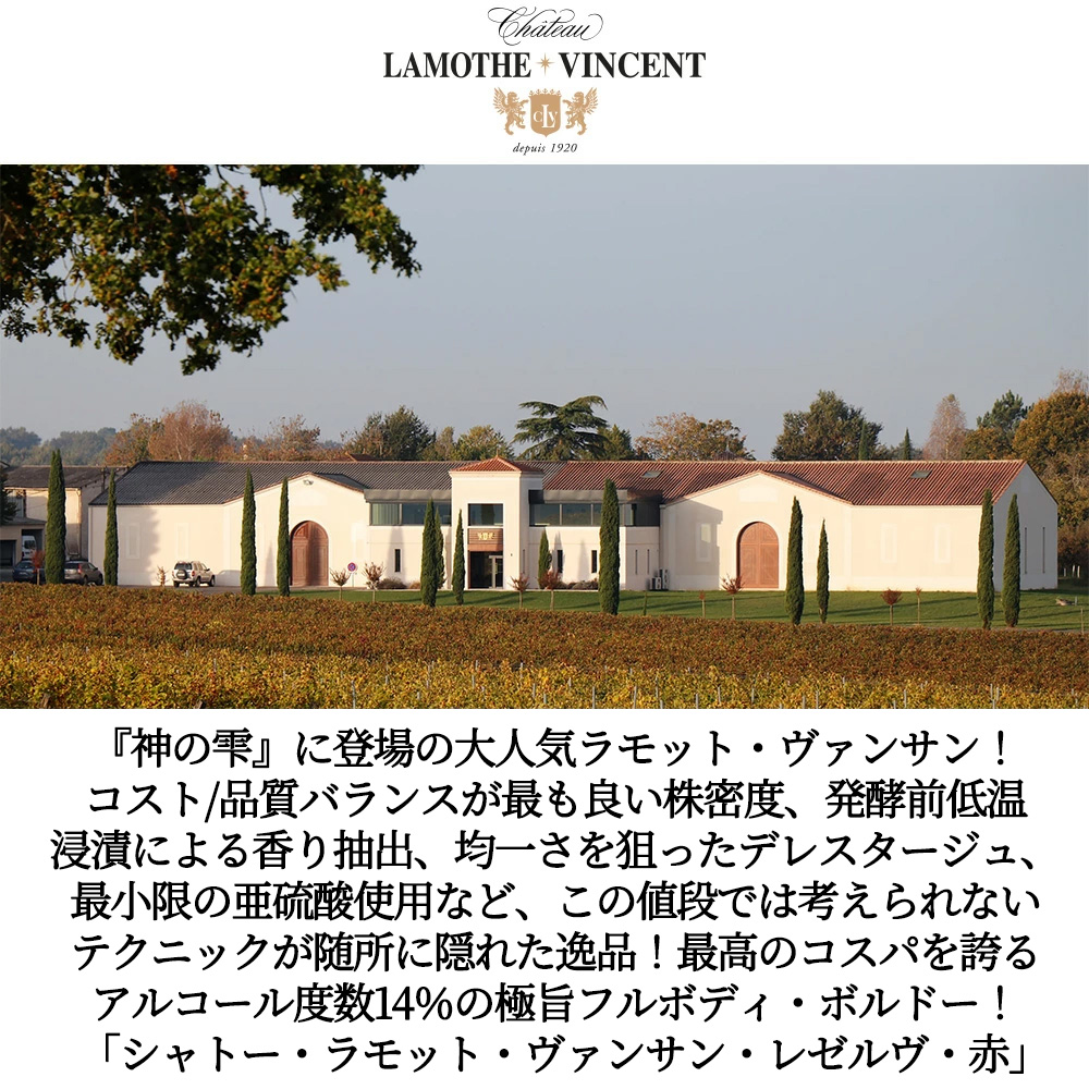 【商品名】シャトー・ラモット・ヴァンサン・レゼルヴ・赤[2023]年・ヴァンサン家元詰・AOCボルドー・赤・辛口・フルボディ・750ml・アルコール度数14%【英名】Chateau Lamothe Vincent Reserve Rouge 2023 Vignobles Vincent AOC Bordeaux