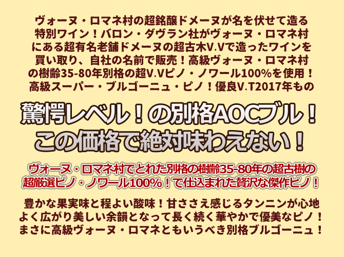 ![]() バロン・ダヴランは、ブルゴーニュ地方ヴォーヌ・ロマネの有名なネゴシアン。実はこちらのブルゴーニュ・ピノ・ノワールはヴォーヌ・ロマネにある非常に有名なドメーヌが敢えて名前を伏せて造っている特別なワインです。 ヴォーヌ・ロマネと言えば、「ブルゴーニュの丘の中心に輝く宝石」と称えられ、ロマネ・コンティを始め、リシュブールやラ・ロマネ、エシェゾーなど、有名なグラン・クリュが並ぶ、ブルゴーニュ・ラヴァーにとってまさに憧れの地。土壌、日照条件、気温と全ての要素がブドウ栽培にとってこれ以上ないという恵まれた条件を備えており、その完璧なテロワールからブルゴーニュの中で最上のアペラシオンとされています。 この村で造られるワインの香りの特徴は何と言っても、スミレの花。若いうちから味わい全体のバランスが良く、シルキーなタンニンがきめ細かく溶け込んでいます。優雅さと気品を備えた、濃密な上に、華やかでエレガントであるところが世界中の人々の心を魅了してやまない所以です。 こちらのブルゴーニュ・ルージュはA.C.ブルゴーニュではありますが、全てヴォーヌ・ロマネ村にある区画から収穫された、樹齢35年~80年のピノ・ノワールをふんだんに用いている贅沢な造りのワイン。 ドメーヌでは、伝統的な手法でワイン造りを行っており、その工程においてはブドウ果実を傷つけないよう、常に最新の注意を払っています。軽く圧縮した後は、3ヵ月間はタンクで、さらに7ヵ月間はオーク樽で熟成。最後の澱引きとボトリングは、グラヴィティシステムを採用しています。グラヴィティシステムとは、ワイン醸造工程において、機械などを使用せずに上から下へかかる重力によってブドウやワインを移動するシステムのこと。ブドウやワインへのダメージを防ぎ、極めて丁寧に扱うことができるため、ブドウ本来の風味を損なうことなく個性豊かなワインに仕上げることができます。 ![]() | ![]() ブルゴーニュ ピノ・ノワール 2017年 バロン・ダヴラン やや紫がかったルビー色。ラズベリーやストロベリーなどのフレッシュな赤系果実にスミレの花の華やかな風味は正統派ブルゴーニュの正しき姿を思わせます。驚くほど滑らかで官能的な舌触りはAOCブルゴーニュの品質を遥かに超えています!豊かな果実味と程よい酸味、甘ささえ感じられるタンニンが心地よく広がり美しい余韻となって長く続きます。エレガントという言葉はまさにこのワインのためにあると言っても過言ではない仕上がり。 しかもお手頃なプライスながら、ヴォーヌ・ロマネの真髄を感じることができるこの華やかで優美なピノ・ノワールをぜひお愉しみください。 お料理と合わせるなら、フォアグラを使ったお料理や、仔羊のロースト、チーズなどが好相性。牛のたたきやマグロのお刺身など、和食との相性も抜群です。 |