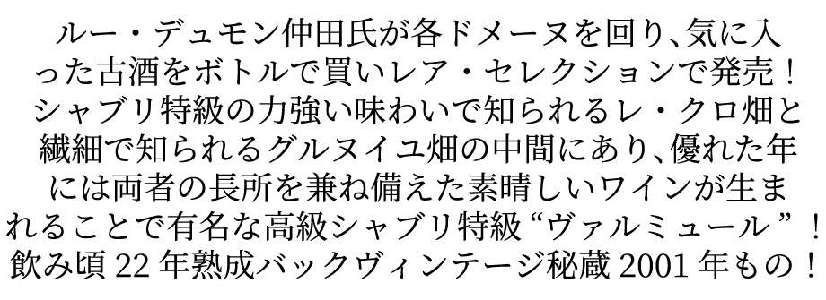 シャブリ グラン クリュ 特級 ヴァルミュール 2001 秘蔵特別輸入品 ルー デュモン レア セレクション AOCシャブリ グラン クリュ