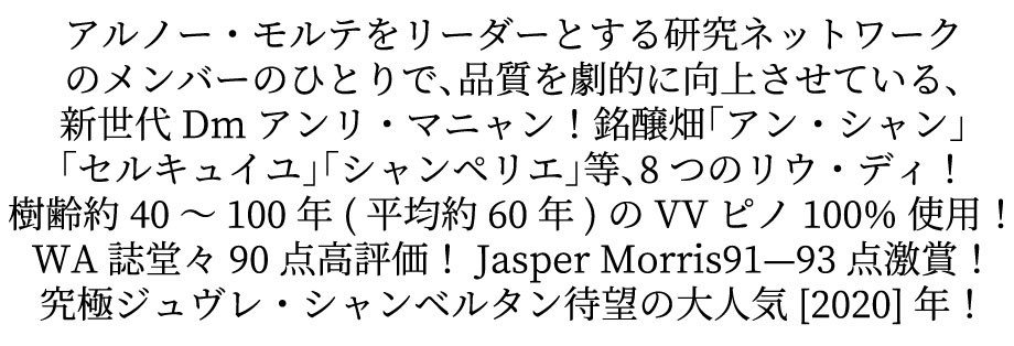 ジュヴレ シャンベルタン ヴィエイユ ヴィーニュ 2020年 蔵出し品 ドメーヌ アンリ マニャン元詰 AOCジュヴレ シャンベルタン ■発酵・熟成:新樽30%、1~3回使用樽70%で12ヶ月間の熟成 ■樹齢:樹齢約40~100年(平均約60年) ■土壌:沖積土質・泥灰土質土壌 人気急上昇中!ブルゴーニュ辛口赤ワイン愛好家大注目!力強いストラクチャーと優雅さを併せ持つブルゴーニュの王様!と言われるジュヴレ・シャンベルタンAOC!しかも1656年にすでにジュヴレ・シャンベルタン村の住人であったという由緒ある生産者でヨーロッパ中のワイン愛好家やワインショップからの注文で毎年、ほぼ完売状態が続く人気ドメーヌ! 「繊細で薫り高いワイン!気品があり絹のような滑らかなタンニンを伴う、バランスの良いワイン」! アンリ・マニャンが手掛ける村名ジュヴレと比べると、より深みがあり濃厚なスタイルの究極ジュヴレ・シャンベルタン!
