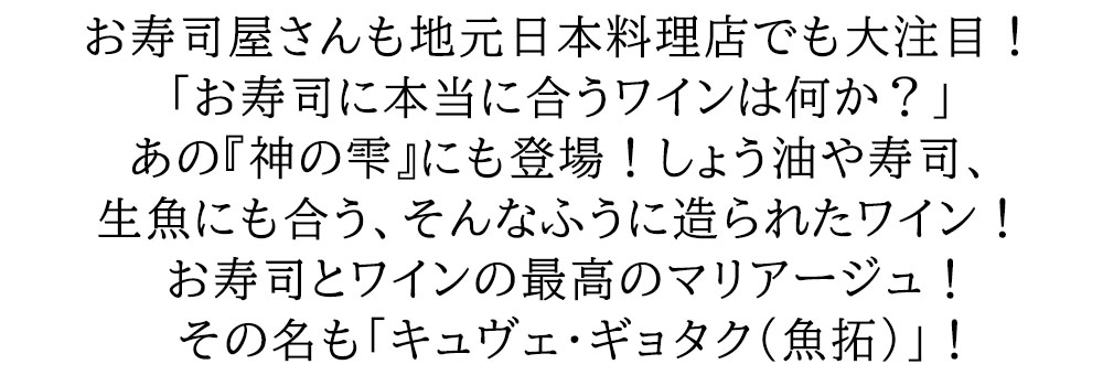 ![]() アルザス キュヴェ ギョタク 2024 ドメーヌ テール デトワール元詰 ミットナット家 AOCアルザス 自然派 ヴァン ナチュール ビオディナミ ■ぶどう品種:リースリング/ゲヴュルツトラミネール/ミュスカ/ピノ・グリ/ピノ・ブラン ■平均樹齢:30年 ■土壌:粘土石灰質土壌 アルザス辛口白ワイン愛好家大注目!お寿司屋さんも地元日本料理店でも大注目! 「お寿司に本当に合うワインは何か?」あの『神の雫』にも登場! 「Gault & Millau」、「Guide Solar」、「Guide Hachette」等ワインプレスも大注目!しょう油や寿司、生魚にも合う、そんなふうに造られたワイン!お寿司とワインの最高のマリアージュ!その名もキュヴェ・ギョタク(魚拓)! 赤坂のレストランで長年シェフを務めていたドメーヌの奥さんの“由佳さん”と夫のクリストフが「一口にお寿司に合うと言っても、お魚だけではなく、酢飯、わさび、しょうゆ、ガリとも合わなくてはなりません。」と研究を重ねた夫婦が辿り着いたひとつの結論がこのリースリング、ゲヴュルツトラミネール、ミュスカ、ピノ・グリ、ピノ・ブランの5品種のブレンドだった! 人気の「gentil(ジャンティ)」の人気[2024]年ものが蔵出しで限定少量入荷!お寿司屋さん、和食屋さんにもおすすめです! |