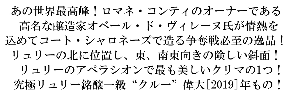 リュリー プルミエ クリュ 一級 クル ブラン 2019 ドメーヌ ド ヴィレーヌ元詰 AOCリュリー プルミエ クリュ 一級 自然派 白 辛口
