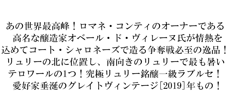 リュリー プルミエ クリュ 一級 ラブルセ ブラン 2019 ドメーヌ ド ヴィレーヌ 自然派 ビオロジック ヴァンナ チュール 白ワイン 辛口 ■ぶどう品種:シャルドネ100% ■土壌:白い粘土質土壌 ■地形:斜面最上部 ■気候:陽当たりが良く暑い畑 あの世界最高峰ワイン!ドメーヌ・ド・ラ・ロマネ・コンティのオーナー(ド・ヴィレーヌ氏)の手によるもう1つのドメーヌ! マスター・オブ・ワインでブルゴーニュワイン評論家の大御所、セレナ・サトクリフ女史をして「リュリーのワインはフィネスを備えていることと、麦わらのような風味を持つことで特に知られ、半ば花、半ば香料棚のようで、それもシナモンが一番目立つ」と激賞させた人気AOCリュリー! 1986年からビオロジック栽培に取り組み、1997年に認証を得ています!『ラテン語で「当社のRully 1er Cruは白 ラブールセ」は、「通常の方向とは逆の方向にある場所」を意味する言葉で、リュリーの北側で最も高く暖かい丘陵地に位置するクリマです。 ドメーヌからのコメントは,南向きの『リュリーで最も暑いテロワールのひとつで栽培されているにもかかわらず、2019年のRully1er Cru Rabourceの香りは、白い花のノートを表現したフルなものです。白い花、蜂蜜、新鮮な柑橘類の詰まったワインです。口に含むと、その非常に素晴らしい粒立ち、強壮感、濃密さに驚かされるでしょう。エネルギーと新鮮さがあり、口の最後にブドウの皮の少し苦いニュアンスが加わり、とても魅力的な味わいです。ブドウの皮のニュアンス、塩味のとても良い印象を与える。ダイナミックで生き生きとした、素晴らしいワインです。』世界最高峰ドメーヌ・ド・ラ・ロマネ・コンティ!!