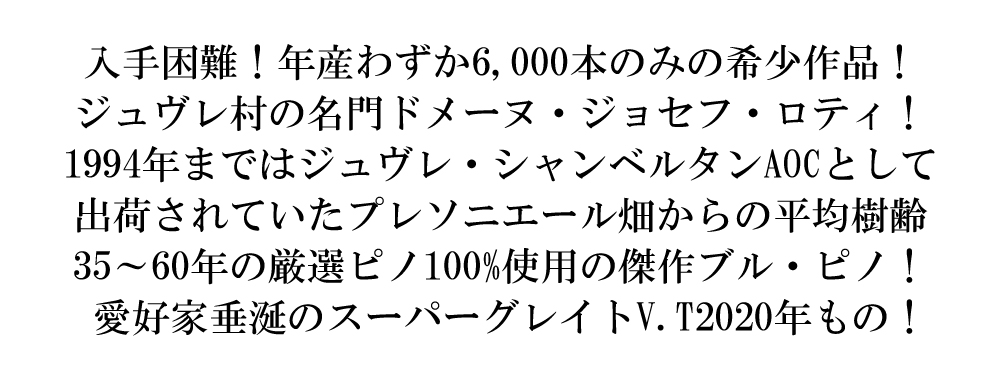 ブルゴーニュ ピノ ノワール キュヴェ ド プレソニエール 2020 蔵出し限定品 ドメーヌ ジョセフ ロティ AOCブルゴーニュ ピノ ノワール ■ぶどう品種:ピノ・ノワール ■発酵・熟成:オーク樽100% 12ヶ月熟成 ■樹齢:平均35~60年 造り手は、現当主で23代目(ドメーヌとしては11代目)になる、ジュヴレ・シャンベルタン村の名門中の名門ドメーヌ! 濃厚なチェリーのような風味に力強さと洗練さを兼ね備えたピュアな果実味たっぷりの旧ジュヴレ・シャンベルタンAOCの究極辛口赤ワイン