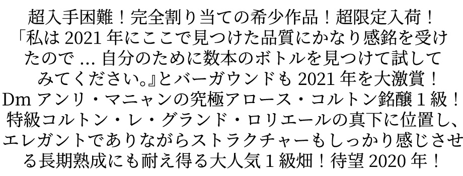 アロース コルトン プルミエ クリュ 一級 ラ クティエール 2021 蔵出し限定品 ドメーヌ アンリ マニャン元詰 AOCアロース コルトン 辛口