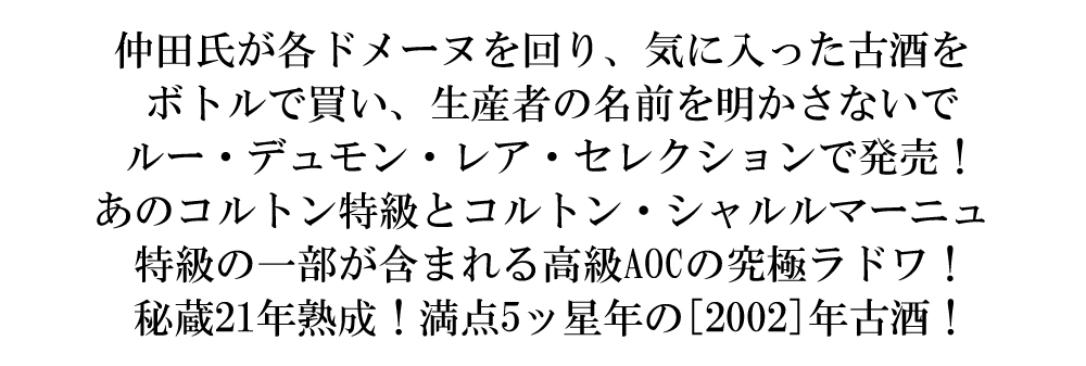 ![]() 仲田晃司。大学生時代にアルバイト先のフレンチレストランでワインに出会い、「いつか自分の手でワインを造ってみたい」という夢を抱いた青年は、1995年、頼るつてもなく単身渡仏。フランス語の勉強をしながら各地の醸造家の門を頂いて修行を重ね、2000年7月7日、ブルゴーニュの地にルー・デュモンを設立しました。仲田さんのワイン造りを特徴付けているのは、まさしく日本人職人的と言うべき、周りがあきれるほど細部まで徹底的にこだわる仕事への執念です。仕込むワインのテロワールや個性を研究し尽くした上で、樽の選定眼や熟成方法を駆使してワインを磨き上げます。 ![]() 2003年5月、在りし日のアンリ・ジャイエ翁より「自分自身のアイデンティティをワインに表現せよ」 との薫陶を受け、「日本人であるということ」「自然と人間に対する真摯な尊敬の念」の象徴として、「天・地・人」が生まれました。 「ワインを通じてアジアの架け橋になれればと願っています」という仲田さん。現在ルー・デュモンのワインは、日本、韓国、台湾、中国、香港、シンガポールといったアジア諸国を中心に販売されています。 ![]() ドメーヌだけでなくネゴシアンにも「新世代」が台頭している。この中で一人の日本人の名前がフランス国内外で語られるようになった。「コージ・ナカダのルー・デュモン」である。すでに日本でも有名な仲田氏は、ネット上では「アンリ・ジャイエに絶賛された」、「サムライ」といった、わかりやすい切り口で紹介されることが多い。だが彼と話したり、そのワインを飲んだりしていちばん感じたことは、「ここまで消費者のことを考えている生産者は珍しいのではないか」ということだった。ワインの輸出先は日本だけではないが、日本を知る彼からは「ワインと飲み手の間にある『壁』を、少しでも取り除きたい」という信念がひしひしと伝わってくるのである。 | ![]() ■ぶどう品種:ピノ・ノワール100% 大人気ラドワの赤の貴重な23年熟成!バックヴィンテージ秘蔵古酒!しかもクリスティーズのオークショナーでM.W.のマイケル・ブロードベント氏は2002年のブルゴーニュ赤ワインに★★★★★5つ星満点年とし、「極めて良い年!1988年以来最小の収穫量。熟したブドウの実、厚い果皮、良い色、ソフトなタンニンと優れた酸味!すべて最良の年の特徴である」と絶賛ヴィンテージ! ラドワの赤と言えば、あのコルトン・グラン・クリュ特級とコルトン・シャルルマーニュ特級の一部が含まれる究極ラドワ!あのワイン評論家のマット・クレイマー氏に「アメリカでは、ラドワ・セリニを見かけることはめったにない。私はいつもブルゴーニュやパリのレストランのリストをさがすことにしている。必ずやお買得である」と絶賛させたラドワの赤! 造り手は、フランス・ワインガイド アシェット誌にも掲載!NHK「プロフェッショナル『仕事の流儀』」にも登場された仲田晃司氏! ルー・デュモン・レア・セレクションとして発売される人気のラドワ・ルージュAOC、非常に綺麗にこなれたブルゴーニュ古酒、貴重なグレイトヴィンテージ2002年秘蔵限定古酒が限定で、しかも現地のセラー数ヶ月前のセラー出しで限定少量入荷!23周年の記念ボトルに!成人を迎えられた2002年生まれの方へのプレゼントにも最適です! |