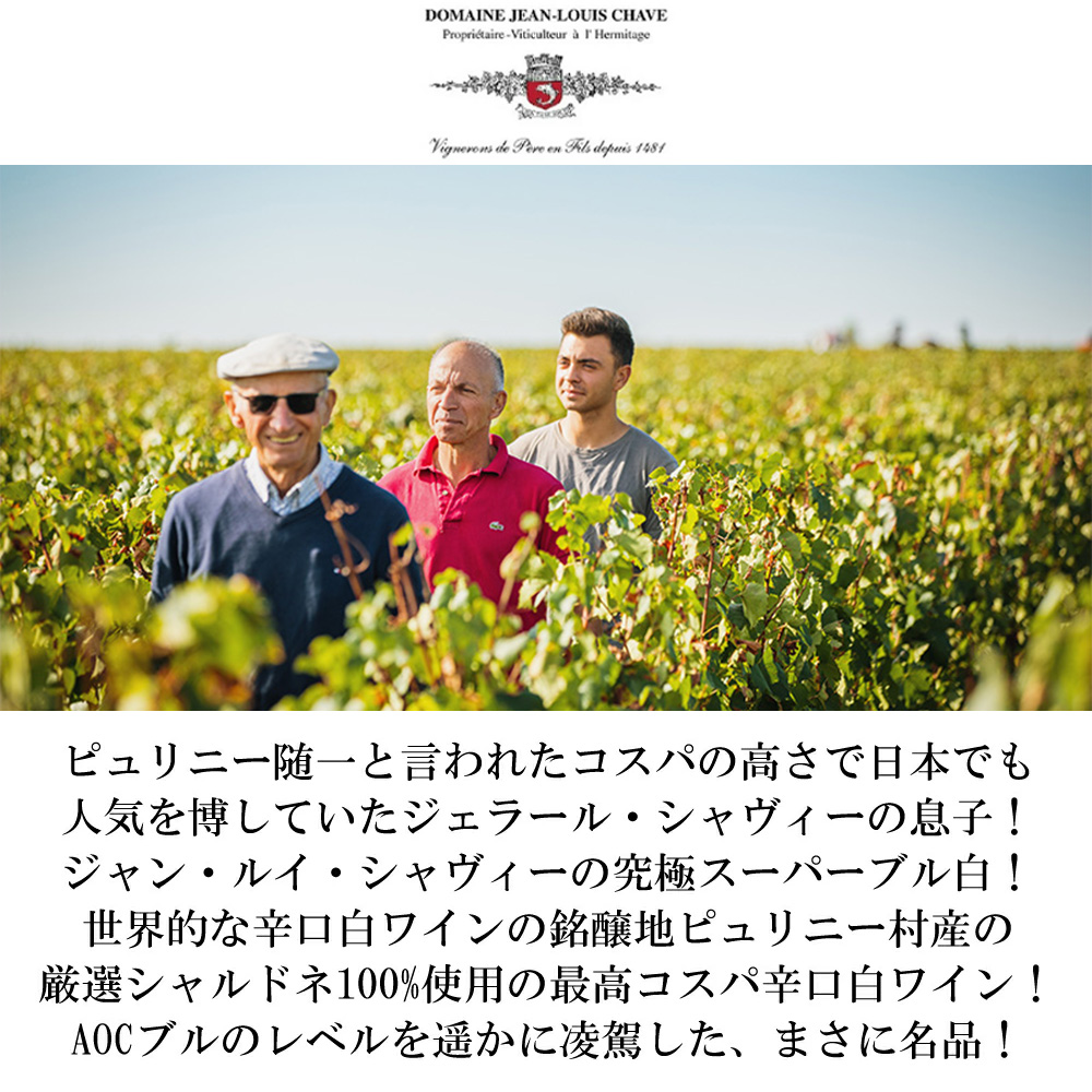 【商品説明】希少!フランス・ブルゴーニュ辛口白ワイン愛好家大注目!高級ピュリニー・モンラッシェ村内のシャルドネ100%で造られるAOCスーパー・ブルゴーニュ・シャルドネ!しかも少量生産で有名な大人気の2021年で限定少量入荷!ピュリニーモンラッシェと言えば白ワイン愛好家を魅了するシャルドネの特徴を素直に反映し、ミネラリーな高級ワインを産出する世界的な辛口白ワインの銘醸地!三大白ワインの銘醸地のひとつ!ピュリニー・モンラッシェ村!そのピュリニー・モンラッシェ村産の究極スーパー・ブルゴーニュ・ブラン! しかも造り手は、「La Revue du Vin de France」、「Guide Hachette」、「Decanter」、「Burghound」、「Bourgogne Aujourd'hui」等ワインプレスも大注目!ピュリニー随一と言われたコスパの高さで日本でも人気を博していたジェラール・シャヴィー!2002年、彼の引退に伴って、2人の息子が畑を半分ずつ分割相続して独立!兄ジャン・ルイ・シャヴィーは、清涼感とフィネスに溢れていた父のワインのスタイルを受け継ぎつつ、ピュリニーならではの豊かなミネラル感や美しい酸といった要素をよりしっかりとワインに表現することを重視し、複雑で気品のある、ミネラルのうまみたっぷりのピュリニーを誕生させています。!それを可能にしたのは、「仕事時間の95%は畑にいます」という畑仕事への入魂。実質的に農薬や化学肥料は使用せず、自然なアプローチによって畑の生態系を守り、活性化しています。また、休日には山に登って、花や野鳥などの写真を撮るのが好きだという根っからの自然志向。やはりよいワインはよい畑から、そして、よい人から、です。しかもジャン・ルイ・シャヴィー氏は父の意志を継いで蔵出し価格を低く抑え、圧倒的なコストパフォーマンスを実現! このブルゴーニュ・シャルドネは、ピュリニー・モンラッシェ村内の国道の反対側に位置する0.8haの畑からの平均樹齢30年のシャルドネ100%を1~3回使用樽で10ヶ月熟成で造られる極めてコストパフォーマンスの高い、ピュリニーモンラッシェ村産100%の高級ブルゴーニュ・ブラン!シャープで伸びのある酸!バランスが良く、AOCブルゴーニュのレベルを大きく超えたコスパに優れた名品!究極スーパー・ブルゴーニュ・ブランが希少で大人気の[2021]年で現地のセラー数ヶ月前の蔵出し品で限定で極少量入荷!