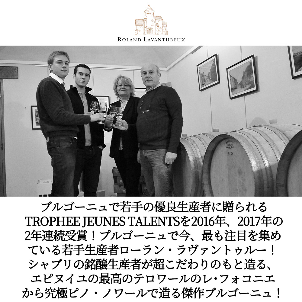 【商品説明】こだわり高級ブルゴーニュ愛好家大注目!愛好家待望の生産量激減ながら素晴らしい品質となった[2021]年ものが遂に登場!トロフェ・ジューヌ・タレント2年連続受賞のシャブリの銘醸が造る究極ブルゴーニュ・ピノ・ノワール! 造リ手は、ローラン ラヴァントゥルー氏がボーヌのワイン学校で学んだ後、1978年シャブリの中心街から北西に約10km離れたLignorelles (リニョレル) の街にドメーヌを設立!一族では以前からブドウ栽培を行っていましたが、農産物のひとつに過ぎず、ローランの祖父母も若干のシャブリを生産していましたが、生産されたワインのほとんどは家族や友人用の自家消費用でした!ローラン氏は受け継いだ5ha程の畑からドメーヌとしてはじめ、妻ブリジットさんと共に地道に広げていき、現在では20hを超えるまでに成長! 今ではローラン氏の二人の息子がドメーヌを継承!兄アルノー氏は主に栽培と醸造、弟ダヴィッド氏は主にマーケティングやセールスを担当!兄弟がドメーヌを受け継いでから、古き良き伝統を受け継ぎながらも、若い感性によって、洗練されたミネラル感とフィネスのあるワインが高く評価!ブルゴーニュで若手優良生産者に贈られるTROPHEE JEUNES TALENTS (トロフェ ジューヌ タレント) を2016年に次いで2017年も2年連続で受賞するなどシャブリのみならず、プルゴーニュで今、最も注目を集めている若手生産者! ずばりドメーヌ ローラン ラヴァントゥルーからの珍しいこだわり究極ブルゴーニュ・ピノ・ノワール!このブルゴーニュ・エピヌイユ・レ・フォコニエは、兄弟の母方の家系から受け継いだ区画 (祖父が第二次世界大戦後、ブドウ畑に植替。) エピヌイユの最高のテロワールであるレ・フォコニエに植えられ、この丘の半分を占めています!日当たりは南と南東!平均樹齢50年以上で非常に高品質のピノ・ノワール!小粒葡萄で、高濃縮度!畑とドメーヌでの作業は、コート・ド・ニュイのグラン・クリュと同じように造られる!収量を抑える為、非常に短い剪定 (2019年産は12hl/haとコート・ド・ニュイのグランクリュよりも低く抑えられています。) その後全ての複芽をひとつひとつ除き葉も手で適度に摘み取り!除草は耕作し有機栽培!手摘み100%!葡萄が痛まないように、専用のレセプション・システム導入!醸造は果実味を最大限引き出す為、低温のタンクで醗酵「イントラペリキュレール」を行う!非常に高い精度とフォローアップが必要で、よりリスクが高く、珍しい手法!その後、350L樽で12ヶ月熟成! 若いピノ・ノワールの黒鉛の要素があり、ほのかに焼けたニュアンスがあります!粘性が高く、非常に凝縮されており、濃密な果実味を感じる傑作ピノ・ノワール!今、大注目のシャブリの若手優良生産者ローラン・ラヴァントゥルーが造る珍しい究極ピノ・ノワールが重厚ボトル&ロウ封印ボトルで蔵出しで限定で少量入荷!