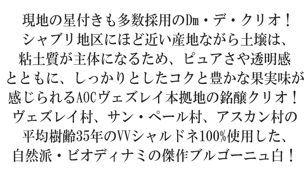「ブルゴーニュ・ブランとヴェズレイの畑は、いずれもヴェズレイ村、サン・ペール村およびアスカン村にありますが、アペラシオンによって土壌が大きく異なります。ブルゴーニュ・ブランは泥土質土壌のためフルーティーで華やかなスタイルになり、ヴェズレイは粘土質主体の土壌のため濃厚でリッチな味わいになります。ヴェズレイのリウ・ディ「ル・クロ」は丘陵斜面畑上にあり、こちらは石灰質主体の土壌のためミネラル感たっぷりのワインになります。これらのテロワールの違いをはっきりと表現するためにビオロジック栽培を行っており、また醸造においても樽は使用せず、ニュートラルなエナメル製タンクを採用しています」。  ドメーヌ名の「クリオ」は、ヴェズレイの粘土石灰質土壌に多く見つかるハート型の化石のことです。