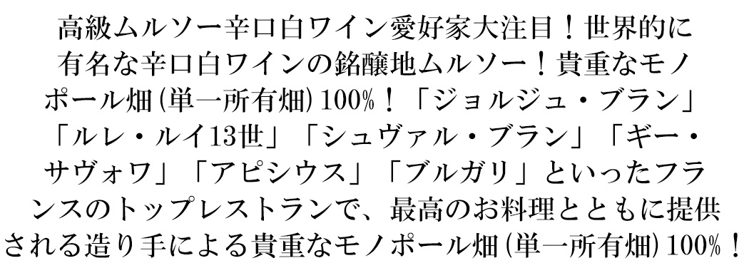 その言葉通り、彼女は毎年一定数のワインを販売せずに貯蔵し、ドメーヌのカーヴで熟成させてから販売しています。そしてそのバックヴィンテージは、「ジョルジュ・ブラン」「ランブロワジー」「ルレ・ルイ13世」「プレニチュード・シュヴァル・ブラン」「レストラン・ケイ」「ギー・サヴォワ」「アピシウス」「ブルガリ」といったフランスのトップレストランで、最高のお料理とともに提供されています。 | ![]() ■ぶどう品種:シャルドネ100% ■発酵・熟成:ステンレスタンクで発酵後、16-18ヶ月間熟成 ■樹齢:平均樹齢40年のVV ■土壌:石灰質主体の粘土石灰質土壌 希少!高級ブルゴーニュ辛口白ワイン愛好家大注目!高級ムルソー辛口白ワイン愛好家大注目!ミネラリーでリッチなテクスチャーで世界的に有名な辛口白ワインの銘醸地ムルソー! 平均樹齢40年のVVから採れるぶどうを使用し、石灰質主体の粘土石灰質土壌で栽培されている。収量は10-35hl/haと制限されており、ステンレスタンクで発酵後、16-18ヶ月間熟成させる。ドメーヌ・フランソワ・ゴヌーは、厳格なリュット・レゾネ栽培を行い、樽を一切使用せず、ぶどう本来の美味しさやミネラルを引き出している。花束のような芳香とハチミツのようなコク、美しい酸とミネラルが特徴の、洗練されたスタイルのワインであり、優良なテロワールを見事に体現した、秀逸なムルソー・モノポール畑の作品である。グレイト2020年ヴィンテージとして、限定少量で入荷している。 |