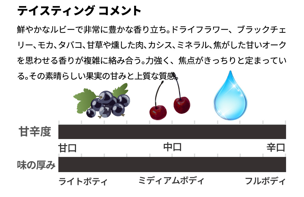 驚くべき長命で複雑味溢れる香りと、洗練され、しなやかさと力強さとを見事に調和させた素晴らしいワインの数々。スティーブン・タンザー氏やロバート・M・パーカー氏など多くのジャーナリスト、評論家が全てのキュヴェに対して大変高い評価を与えており、その人気は近年とどまる所を知りません。