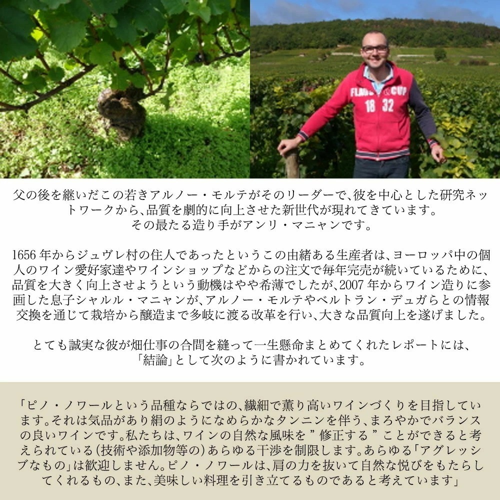 (当店オーナー広瀬の体験談より)このドメーヌのワインを販売するにあたり当店オーナー広瀬も2009年秋と2010年春のブルゴーニュ訪問で感じた事として、会議の中で触れていました。特にこのアンリ・マニャン以外にも、超完璧主義者として有名なドゥニ・モルテの息子、アルノーモルテを中心にベルトラン・デュガ達と研究ネットワーク(情報交換に参加)している(次回は絶対手に入れたい)ドメーヌP~、L~などがある。
