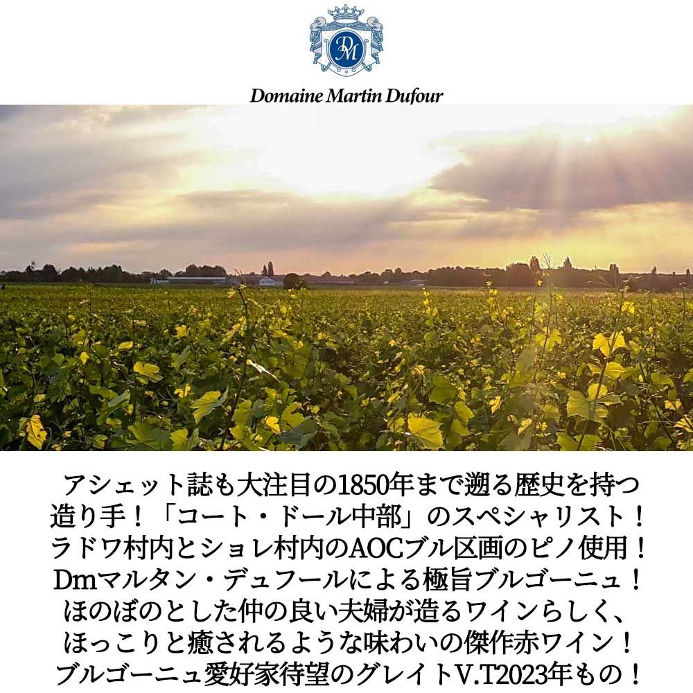 【商品説明】入手困難!ブルゴーニュ辛口赤ワイン愛好家大注目!アシェット・ガイド誌2024年版でも大注目!生産量のほとんど (90%) がフランス本国のワイン愛好家やフランスのワインショップやレストランに直行!残りの10%はEU諸国に輸出されるため、日本の愛好家が入手するチャンスは極少量!しかも大人気グレイトヴィンテージ[2023]年もの (ブルゴーニュワイン委員会は「赤と白の両方で、美しい香りのプロファイルを備えた、表現力豊かでフルーティなワインが生まれた」と大注目) で待望の超限定入荷! 造り手のマルタン家は1850年からショレー・レ・ボーヌ村で歴史があるヴィニュロンの家系で、ニュイ・サン・ジョルジュ、ラドワ、アロッス・コルトン、ショレー・レ・ボーヌ、サヴィニー・レ・ボーヌに畑を所有する、「コート・ドール中部」のスペシャリスト!1990年にドメーヌを継承した6代目ジャン・ポール・マルタンは、他に先駆けてリュット・レゾネ栽培を開始!「評論家を唸らせるようなスタイルのワインではなく、毎晩のお料理に合わせて美味しく、安心して飲んでいただける味わいのワイン造りを目指しています。昔はそれこそ新樽とかも使っていたのですが、家庭料理に合わせにくいという声が多く、今は樽自体、最小限しか使わなくなりました」とジャン・ポール氏! 当時より「自然を尊重し、自然な造り方で造ったワインは、体にも優しい」をポリシーとしているDmマルタン・デュフールによる傑作スーパー・ブルゴーニュ・ルージュ! このピノ・ノワールはラドワ村内のACブルゴーニュ区画「レ・ムト」と、ショレー・レ・ボーヌ村内のACブルゴーニュ区画「レ・テュ・ブフ」の2区画で合計0.53haからの畑からの樹齢30~55年のピノ・ノワール100%を収量は40hl/ha!ステンレスタンクで10ヵ月間熟成で造られる極旨スーパー・ブルゴーニュ!実際、ほのぼのとした仲の良い夫婦が造るワインらしく、ワインもとても酸とのバランスが良く、ほっこりと癒されるようなスタイルに仕上がった赤ワイン!しかもグレイトヴィンテージ[2023]年ものが現地のセラー数ヶ月前の蔵出し限定作品で極少量入荷!