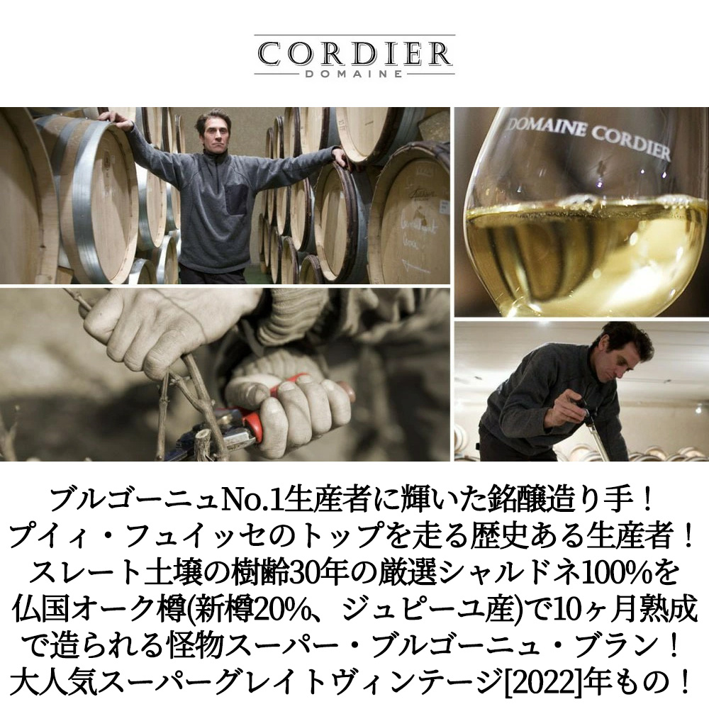 【商品説明】ブルゴーニュ辛口白ワイン愛好家大注目!しかも大人気スーパーグレイトヴィンテージ[2022]年!(ブルゴーニュ委員会による評価は『ワインは良質で、凝縮感とバランスに優れている。極端な暑さに見舞われた年であったというのに、新鮮な果実のアロマと躍動感が明るい未来を感じさせる、驚くべきヴィンテージとなった。白ワインは、その丸み、滑らかさ、そして複雑さで際立っている。リッチで非常に表情豊か、果実のアロマが過度にならずに存在感を示している。味わいでは、みずみずしい果実味とバランスの良さが生き生きと持続する。』と大絶賛!アシェット・ガイド誌2024年版でも18/20点を付けるスーパーグレイトヴィンテージ)でついに入荷!ロバートパーカー★★★★★5つ星生産者を獲得!(プイィ・フュイッセについては、そのほとんどが90点以上)ブルゴーニュ・ワイン専門誌「ブルゴーニュ・オージュルデュイ」誌では、ニュイやボーヌの名だたる生産者を押さえ、2005年のブルゴーニュNo.1生産者に輝く銘醸!1930年代に創業されたプイィ・フュイッセのトップグループを走る歴史ある生産者!あのコント・ラフォンやルフレーヴをはじめ、近年マコネ地区に注目し生産を開始したブルゴーニュ屈指の生産者でさえも、教えを請いに彼の元を訪れるという名門ドメーヌ・コルディエ!による怪物スーパー・ブルゴーニュ・ブラン!スレート土壌の樹齢30年の厳選シャルドネ100%をフレンチオーク樽(新樽20%、ジュピーユ産)で10ヶ月熟成で造られる究極辛口白ワイン!石灰の香り、柔らかく豊満で、滑らかなポワール・ポシェのフレーヴァーを持つこの白ワインは、素晴らしい鮮明さを表している!さすが名門コルディエと大納得の究極スーパー・ブルゴーニュ・シャルドネがスーパーグレイトヴィンテージ[2022]年で蔵出し品で少量入荷!