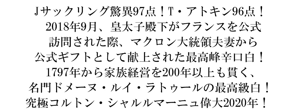 【商品名】コルトン シャルルマーニュ グラン クリュ 特級 2020 蔵出し品 ドメーヌ ルイ ラトゥール元詰 AOCコルトン シャルルマーニュ グラン クリュ 【英名】Corton Charlemagne Grand Cru [2020] Domaine Louis Latour AOC Corton Charlemagne 【商品説明】入手困難!過去、皇太子殿下に献上されたコルトン・シャルルマーニュ!高級ブルゴーニュ辛口白ワイン愛好家大注目!ブルゴーニュ2大高級辛口白ワインのひとつ!コルトン・シャルルマーニュ・グラン・クリュ(特級)!しかも愛好家待望のスーパーグレイトヴィンテージ[2020]年(アシェット ガイド誌2023年版でもブルゴーニュの白に18/20点の高評価&RVF誌96点の高評価)でついに少量入荷!2018年9月、皇太子殿下がフランスを公式訪問された際、マクロン大統領夫妻から公式ギフトとして、この“ドメーヌ・ルイ・ラトゥールのコルトン・シャルルマーニュ2014年”が献上されたとのこと!造り手は、最高水準のブルゴーニュ白ワインの造り手として定評があり、1797年から家族経営を200年以上も貫く、ルイ・ラトゥールのドメーヌもの(ドメーヌものは、ルイ・ラトゥールの全生産量のわずか10%の希少品)「コルトン・シャルルマーニュは、この世で最も劇的なシャルドネである。ひと口ふくむごとに広がる味わいの小宇宙は、決して探りつくすことができない。ミネラルの風味は、ありあまるというより、おそいかかってくるようだ。」とマット・クレイマー氏に言わしめ、ルイ・ラトゥールのコルトン・シャルルマーニュについては、「コルトン・シャルルマーニュの総本山とも言うべき存在で、10haもの区画をもつ大地主、当然のことながらルイ・ラトゥールのそれは、世界中で最もよく知られている。大抵の人は、これを飲んで初めてコルトン・シャルルマーニュを知り、時にはこれ以外を知らない」と大絶賛!R.V.F誌星付で「ルイ・ラトゥールのなんと言っても圧巻なのは、「コルトン・シャルルマーニュ」である。しなやかさが素晴らしく、また舌触りのきめ細やかさも傑出している。」とこれまた大絶賛!石の多い石灰岩質の樹齢30年以上のシャルドネ100%を樽発酵(100%マロラクティック発酵)、新樽(自社製樽)で8~10ヶ月熟成で造られる最高峰辛口白ワイン!この[2020]年にジェームズ・サックリング驚異の97点でコメントは「このアペラシオンに期待される強烈なスパイス、大胆な骨格、鋼鉄のような味わいを持つ、非常に冷涼で引き締まったコルトン・シャルルマーニュ。驚異的な凝縮感があり、この初期段階ではワインをやや渋くしているが、このことが素晴らしい熟成の可能性を与えている。素晴らしいフィニッシュでは、オーク、果実味、ミネラルの酸味が見事に調和している。」と激賞!ティム・アトキン96点でコメントは「ルイ・ラトゥールは10.5ヘクタールを所有するシャルルマーニュ最大の土地所有者で、0.5ヘクタール以外はすべて一緒に所有している。ピュアな青梨とハニーデュー・メロンに蜂蜜、バニラビーンズ、ショートブレッドがアクセントを添える。濃密な味わいは、良い意味で享楽的で、その後、生き生きとした酸と一筋の無骨なミネラルがワインに飲みやすさを与えている。」いまやパーカーを凌駕する勢いのアラン・メドゥのバーガウンド・ドット・コムでも91-94点でコメントは「クールでエアリーなアロマは、グラニー・スミス・アップル、柑橘類の果皮、ミネラルの還元と適度な木の影響を感じさせる。繊細なボリュームがあり、ミドルの風味は生き生きとしているが、同じ大きさと重さはない。」さらにワインスペクテーター誌95点!ワインアドヴォケイト誌でも92点でコメントは「2020年のコルトン・シャルルマーニュ・グラン・クリュは、成長期の陽光をすべて反映している。フルボディでリッチ、艶やかで、果実の甘い核と広い肩幅を持ち、そのブーケは桃、バター風味のペストリー、黄金色の果樹園の果実、ベーキングスパイス、バニラのさやを想起させる。このワインは、よりリッチで外向的なスタイルの白ブルゴーニュを好む読者にアピールするだろう。」!各誌大絶賛の究極コルトン・シャルルマーニュ・特級の大人気スーパーグレイトヴィンテージ[2020]年が正規品(蔵出し品)の素晴らしい状態で待望の限定少量入荷! 【タイプ】白・辛口 【生産年】2020 【生産者】ドメーヌ・ルイ・ラトゥール 【生産地】フランス/ブルゴーニュ/コート・ド・ボーヌ/コルトン・シャルルマーニュ/ AOCコルトン・シャルルマーニュ・グラン・クリュ・特級 【品種/セパージュ アッサンブラージュ】シャルドネ100% 【内容量】750ml 【JANコード】0102021052959