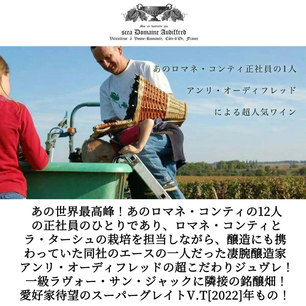 【商品説明】入手困難!ブルゴーニュ辛口赤ワイン愛好家大注目!高級ジュヴレ・シャンベルタン愛好家垂涎!一級畑「ラヴォー・サン・ジャック」「クロ・サン・ジャック」他4つの一級畑に囲まれた銘醸畑!しかも待望のスーパーグレイトヴィンテージ[2022]年 (RVF誌2025年版ブルゴーニュの赤に驚異の98点」の高評価!の大人気で偉大な2022年もの) でついに入荷!年産極少量! あの世界最高峰!あのロマネ・コンティ (DRC) の12人の正社員のひとりであり、ロマネ・コンティとラ・ターシュの栽培を担当しながら醸造にも携わっていた同社のエースの一人だったアンリ・オーディフレッドによる人気ジュヴレ・シャンベルタン!しかも愛好家待望のスーパーグレイトヴィンテージとなった[2022]年もの! アシェット・ガイド誌大注目!リアルワインガイド誌18号では「極めて正しいメンタリティを持った誠実な生産者が造る優しさと奥深さに満ちたハイクオリティなワイン」として特集記事!同誌22号では「各キュヴェとも生産本数は極めて少ない。人気アイテムの入手は容易ではないと思う。ゲットできる幸運を祈るしかないと思う」と大絶賛! しかも、「レ・マルシェ」は、「ラヴォー・サン・ジャック」や「クロ・サン・ジャック」をはじめとするプルミエ・クリュの各畑に挟まれた、斜面上側の畑!しかもオーディフレッドはここにわずか0.43haのみ所有!平均樹齢約35年のVVのピノ・ノワールをオーク樽で約18ヶ月熟成でリリース!オーディフレッドのワインは総じて淡い色合いでピュアで繊細な果実味が口の中に優しく広がります!それでいて大地の滋養や感じるたっぷりとしたエキスの旨みを堪能いただけます!しかも現地セラーの数か月前の蔵出し作品で、しかも大人気で待望のスーパーグレイトヴィンテージ[2022]年で限定少量入荷!