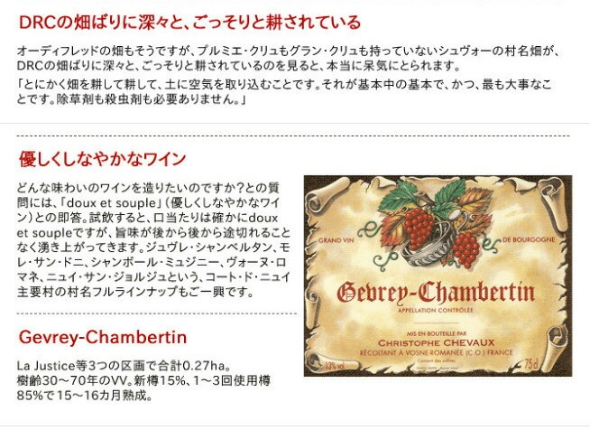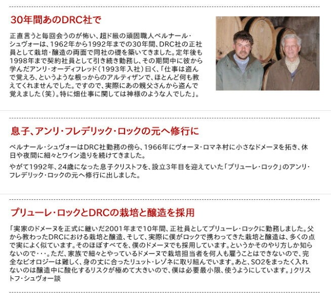 インポーターさんの資料より正直言うと毎回会うのが怖い、超ド級の頑固職人ベルナール・シュヴォーは、1962年から1992年までの30年間、DRC社の正社員として栽培・醸造の両面で同社の礎を築いてきました。定年後も1998年まで契約社員として引き続き勤務し、その期間中に彼から学んだアンリ・オーディフレッド(1993年入社)曰く、「仕事は盗んで覚えろ、というような根っからのアルティザンで、ほとんど何も教えてくれませんでした。ですので、実際にあの親父さんから盗んで覚えました(笑)。特に畑仕事に関しては神様のような人でした」。ベルナール・シュヴォーはDRC社勤務の傍ら、1966年にヴォーヌ・ロマネ村に小さなドメーヌを拓き、休日や夜間に細々とワイン造りを続けてきました。