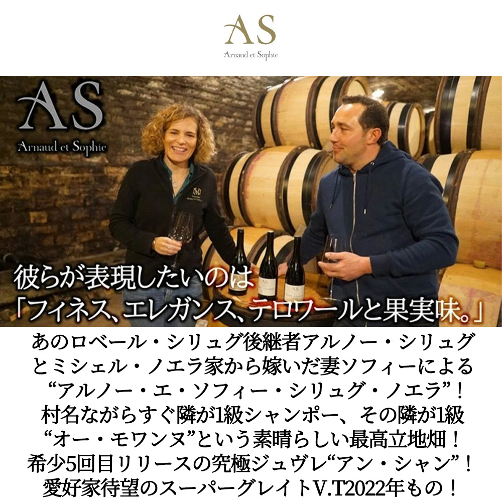 【商品説明】超入手困難!完全割当て品!高級ブルゴーニュ愛好家大注目!高級ジュヴレ・シャンベルタン愛好家垂涎!強いストラクチャーと優雅さを併せ持つブルゴーニュの王様!“ジュヴレ・シャンベルタン”!しかも大人気スーパーグレイトヴィンテージ[2022]年もの (アシェットガイド誌2025年版でブルゴーニュの赤に18/20点の高評価&RVF誌2025年版でも驚異の98点の素晴らしいVT) でついに入荷! 造り手はあのブルゴーニュ最高峰!ロマネ・コンティを擁するブルゴーニュで最も偉大な葡萄畑をもつ村ヴォーヌ・ロマネ村の銘醸造り手ロベール・シリュグの後継者アルノー・シリュグとミシェル・ノエラ家から嫁いだ妻ソフィーによる“アルノー・エ・ソフィー・シリュグ・ノエラ”!アルノー・エ・ソフィーのワインはテロワールの特徴を表現したいため、人的介入をできるだけ少なくしている!彼らが表現したいのは「フィネス、エレガンス、テロワールと果実味!」ソフィーとアルノーはワインに求めるスタイルという点で互いに完全に一致しており、ビジョンとフィロソフィーをワインに表現できるように日々努めています。 ずばりアルノー・エ・ソフィー・シリュグ・ノエラによる究極ジュヴレ・シャンベルタン!しかもジュヴレ・シャンベルタンの人気畑“アン・シャン”!村名ながらすぐ隣が人気一級畑シャンポー!その隣が大人気一級畑“オー・モワンヌ”!その隣が一級カズティエという、素晴らしい最高立地畑で、長期熟成のポテンシャルが高い偉大な村名畑! このジュヴレ・シャンベルタンにWine Report 山本明彦氏は「プルミエ・クリュのシャンポーの斜面下部。全房発酵40%。ルモンタージュもピジャージュも控えめで、ロベール・シュリグと同じ方向を向いている。ガスを残していてフレッシュ。タンニンは柔らかく、レッドチェリー、クラッシュしたストロベリー、シダー、シルキーで、鉄分を帯びたミネラル感、骨格があり、リニアなフィニッシュ。」と大注目!記念すべき5回目リリースの究極ジュヴレ・シャンベルタンがスーパーグレイトヴィンテージ[2022]年で限定で少量入荷!