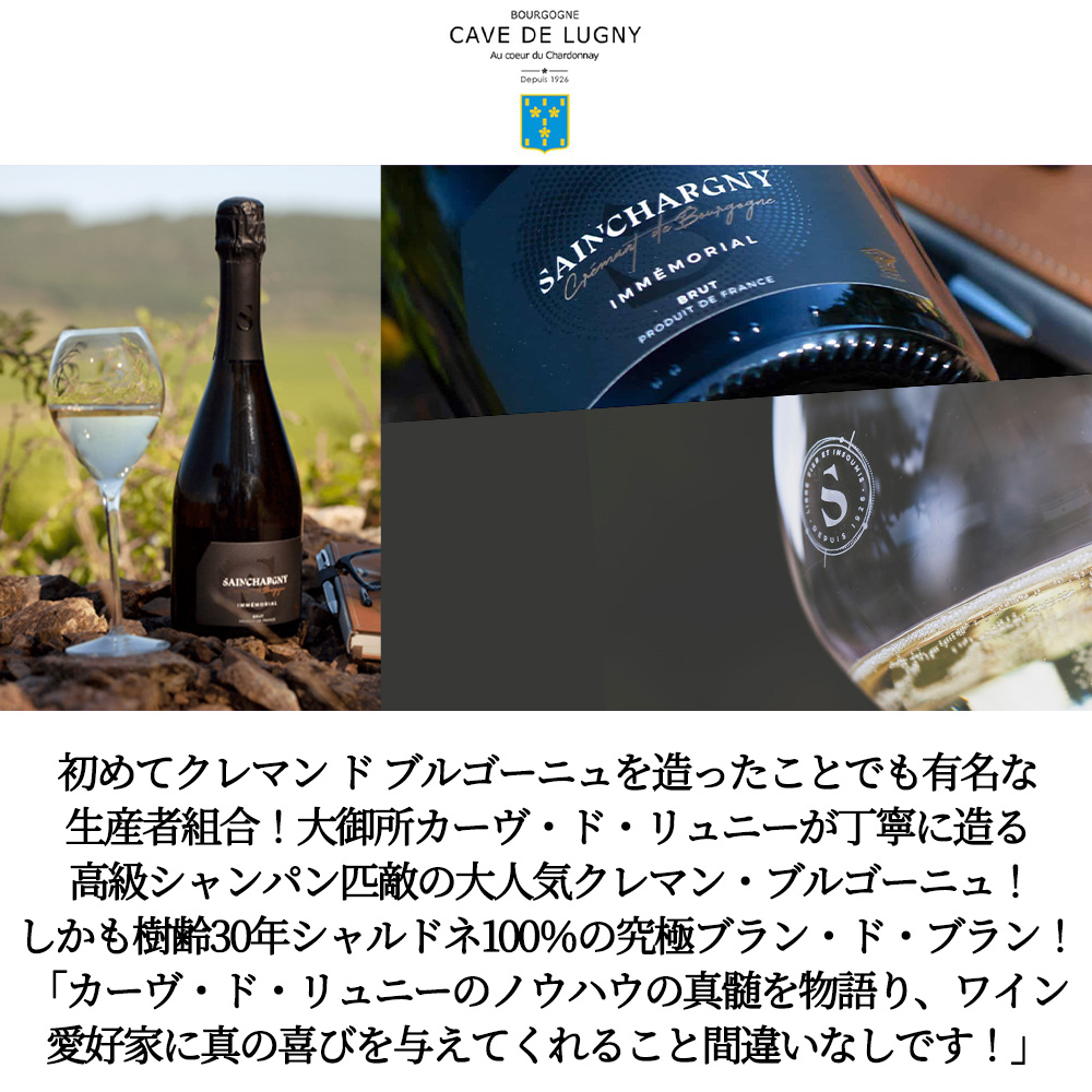 【商品説明】入手困難!シャンパーニュ辛口愛好家も大注目!高級ブルゴーニュ産シャンパン方式辛口クレマンファン大注目!大人気!高級AOCクレマン・ド・ブルゴーニュ!シャンパンと同じ製法の辛口クレマン!しかもシャルドネ100%のブラン・ド・ブラン! しかも造り手はサザビーズのシニア・ディレクターでブルゴーニュワイン評論家の大御所!M.W.のセレナ・サトクリフ女史も大注目!ワイン評論家のヒュー・ジョンソン氏も「ポケットワインブック」で大注目!1927年設立サン・ジョングー・ド・シセやシャルドネの協同組合を吸収し、マコン地区では指折りの生産組合(なんとマコン地区の30%(ブルゴーニュ総生産量の6%)を占める生産量を誇る協同組合!しかもアメリカとイギリスでは、30年以上に渡り、絶大な人気を誇るカーヴ・ド・リュニー! 輸入元さんのコメントは「初めてクレマン ド ブルゴーニュを造ったことでも有名な生産者組合が造るコストパフォーマンス抜群のスパークリングワイン。収穫は全て手作業で、丁寧により分けながら摘み取られ、小分けされた箱でつぶれないように大事に運ばれます。再度、選果された後、空気圧によってプレスされ、純粋な果汁のみが抽出されます。その後、コンピュータ制御されたステンレスタンクで16~18℃で管理されアルコール発酵が行われます。マロラクティック醗酵は100%なされます。シャンパーニュと同様に瓶内二次醗酵は瓶詰め後に起こり、成熟して気泡の最適なクリーミーで細かな泡立ちを得るには少なくとも12ヶ月を要します。これまではシャルドネをメインとしたブレンドでしたが、新たにシャルドネ100%のブラン・ド・ブランへ切り替える事になりました。ゴージャスなラベルとそれに見合う高い品質はこれまで以上にファンを獲得することでしょう。 このクレマン・ド・ブルゴーニュ・ブラン・ド・ブランは、協同組合であるカーヴ・ド・リュニーのメンバーである生産者所有の畑から造られ、全てリュニー村(Lugny)の周辺に位置しています。土壌は石灰岩が主体で、南南東向きの斜面です。カーヴ・ド・リュニーは、2015年2月よりサステナブル・ワイン・グローイング(Sustainable Wine growing: 環境に負荷を与えない持続可能な栽培)の認証を取得しています。」 この「クレマン・ド・ブルゴーニュ・ブラン・ド・ブラン・ブリュット」は、平均樹齢30年以上の厳選シャルドネ100%使用!葡萄は手摘みで収穫され、パンチング・トレイに入れられ、空気圧のプレス機で圧搾!アルコール発酵は温度管理されたステンレスで行われます(16~18度)!100%マロラクティック発酵!瓶詰後、第二次発酵を行い、泡のキメを細かくするために12ヶ月間瓶熟!ドサージュ12g/Lの辛口仕上げで造られる、シャンパン二次発酵方式の究極クレマン・ド・ブルゴーニュ! 輝きのある淡いゴールド、繊細で規則正しい泡立ち!フレッシュで食欲をかきたてる香り!ヘーゼルナッツ、フレッシュバター、アーモンドのノート!味わいは繊細でバランスのとれたこのクレマンは、カーヴ・ド・リュニーのノウハウの真髄を物語り、ワイン愛好家に真の喜びを与えてくれる、完成度の高い、まさにシャンパーニュと言っても過言ではない究極クレマン・ド・ブルゴーニュ!料理のオススメは、タパス、魚、シーフード、鶏肉、フルーツデザート、ホタテのクリームソース添えなど。 高級感溢れるエチケットで限定少量入荷!