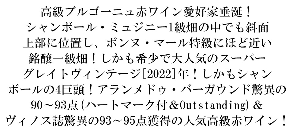 以下リアルワインガイドの抜粋約束の地シャンボル・ミュジニーに、かくも偉大な生産者がいたことを知らなかった我々は、その耽美で不毛な時間を取り戻す術を知らない。 だから今直ぐにでも入して飲まなければならない。人生には三度の避盾がある。もし神が許すというのなら、ユドロ・バイエこそがその艶やかな 出会いのひとつとして、料那の快楽に身を任 せられることが許される唯一無二の存在と言えよう。と、どこかの誰かのように、オーバーで笑ってしまう しかない口調が思わずでてしまうほどにこの生 産者はいい。 シャンボルには3巨頭がある。ルーミエ、ヴォギュア、そしてJ・F・ミュニエだ。しかし本当に オーバーでもなんでもなく、その牙城に食い込もうとしていると断言したい。