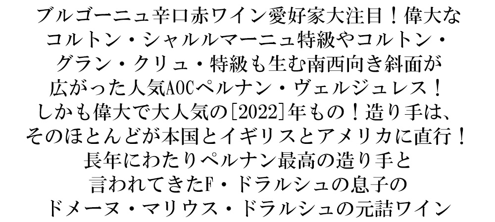 エティエンヌ(マリウス)・ドゥラルシュの白は、ペルナンやコルトン・シャルルマーニュの美点を余すところなく堪能できる現代ブルゴーニュ白の傑作です。コストパフォーマンスに優れたペルナンの赤は、繊細な料理を引き立てる軽やかで上品なスタイルです。