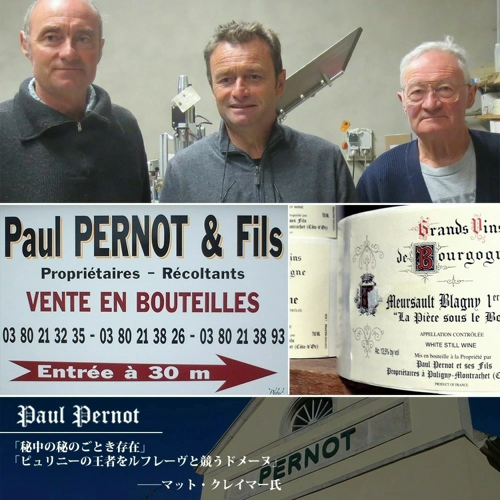 ドメーヌ ポール ペルノについてマットクレイマー氏は“ピュリニ・モンラッシェでは秘中の秘のごとき存在!ピュリニの王座をルフレーヴと競うドメーヌになるだろう”と大絶賛!「たぶん、ピュリニ=モンラッシェは秘中の秘のごとき存在ではなかろうか。そのワインは地元では秘密でもなんでもないどころか有名でさえある。しかしよそ者にはペルノは無名に等しく、それというのも全生産量の六ないし八割をジョセフ・ドルーアンに売ってしまうからだ。だが自前のブドウ畑は素晴らしく、腕前も見事である。フォラティエールには圧倒されるおもいがし、ピュセルとともに畑の最高作かと思う。ピュセルはビアンヴニュ=バタール=モンラッシェにつらなる区画をもつ。やがてワイン全て自家詰めする道を選ぶならば、ドメーヌ・ペルノこそはピュリニの王座をルフレーヴと競うドメーヌになるだろう。」