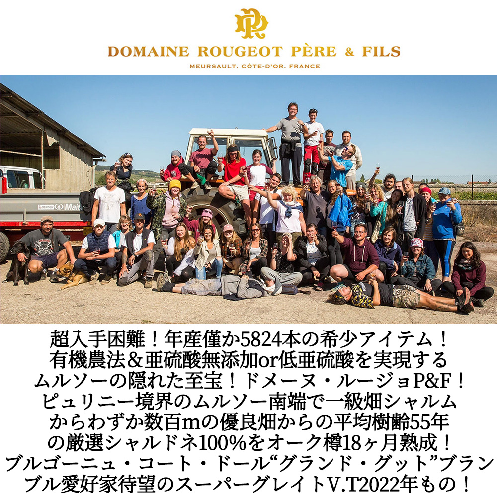 【商品説明】入手困難!高級ムルソー愛好家大注目!高級ブルゴーニュ辛口白ワイン愛好家大注目!年産僅か5824本のみの希少アイテム!有機農法&亜硫酸無添加or低亜硫酸を実現するムルソーの隠れた至宝!今後、入手困難が予想される銘醸ドメーヌ・ルージョ! しかもINAO (原産地呼称委員会) によって2017年に新しく追加されたAOCブルゴーニュのさらに格上の村名AOC!2つの新しいAOCのひとつAOCブルゴーニュ・コート・ドール!リッチなテクスチャーで世界的に有名な白ワインの産地であり、高級辛口白ワインのひとつ!コート・ドールの代表格でもあるムルソー!しかも大人気一級畑の中でも、一級ペリエールと一級ジュヌヴリエールと並ぶ3大プルミエ・クリュの1つ!大人気一級畑ペリエールに隣接する、最大の一級畑で、“肉感的でふっくらとしてミネラル感もある”と言われる究極ムルソー1級畑“シャルム”からわずか数百メートルという最良畑からの究極ブルゴーニュ・コート・ドール・ブラン! しかも待望のスーパーグレイトヴィンテージ[2022]年もの! (偉大なブルゴーニュの大人気辛口白の最新ヴィンテージでスーパーグレイトヴィンテージ!なんと!フランス・アシェットガイド誌2023年版で過去最高評価のひとつ18/20点を付けるスーパーグレイトヴィンテージ[2022]年もの!ちなみに1970年以降18/20点以上をつけるのは1989、1996、2003、2018、2019、2020年、この2022年の7VTのみ。RVF誌でも驚異の98点) がついに入荷! 造り手のドメーヌ・ルージョ・ペール・エ・フィスについて輸入元様のコメントは「ルージョ家は5世代にわたりムルソーでワインを生産してきました。ドメーヌは村の中心部にあり、有機栽培で低硫黄等の最小限の人的介入で静かながらも完璧なワインを生み出しています。所有畑はムルソー内かそのすぐ近くにあります。大部分は1950年代後半に現当主ピエール・アンリ・ルージョの祖父が植樹し、1980年代初頭に彼の父が部分的に植え替えしました。18世紀の石造りの地下セラーは、元々隣接する果樹園用としてオスピス・ド・ボーヌの為に建てられたもので、19世紀にピエール・アンリの曾祖父が購入しました。当時の果樹園は今はエレガントな庭園と、小さなモノポールのぶどう畑に変わっています。地下セラーは、13.0haの畑から2ヴィンテージを完璧に熟成できるように改装されています。 2010年にピエール・アンリがドメーヌに戻って以来、ドメーヌは有機農法を実践しており、2018年ヴィンテージからが正式に有機認証を取得する予定です。彼らの有機農法はぶどう畑の硫黄と銅の削減に積極的です。彼らはぶどう畑で除草剤を使用した事はなく、2012年には全ての農薬の使用を中止しました。テロワールをより多く表現させ、より強いアイデンティティを得たいと思ったからです。哲学は持続可能な農業だけではなく、ワインから最も純粋な果物の表現を抽出する事。醸造過程で使用される亜硫酸塩の量に関する実験を通して、亜硫酸塩がワインの芳香性の範囲と精度を低下させる事を発見しました。細かな対応と的確な処置で栽培時に畑の農薬の除去や硫黄と銅の削減につなげています。注意深く選別する事で亜硫酸塩の必要性を排除しました。 フランス中を旅し経験豊富なピエール・アンリはソーミュールやカオールなど幅広い地域の友人たちによって触発され、柔らかい感性でブルゴーニュの伝統にエッセンスを与え、強く溶け込む為の独特のビジョンを与えています。無硫黄での醸造は、自然なワインのアプローチと伝統的なブルゴーニュのテクニックを、エネルギーとバランスのあるワインを生み出すために、見事に成し遂げています。ワインはとても精力的で、精緻で、そして美味しさに満ちています。このような説得力のあるワインを生産しながら、このドメーヌは静かに黙々と自らの成すべき仕事を完璧にこなしてきました。年産合計25,000本という少量生産の為、これまであまり知られてきませんでしたが、称賛に値する素晴らしいドメーヌであることは間違いありません。」 この「ムルソー・スー・ラ・ヴェル[2022]年」は、ピュリニー・モンラッシェ境界のムルソー南端で一級畑シャルムからわずか数百mの優良畑、粘土石灰岩土壌の1950年~1980年植樹!平均樹齢55年のヴィエイユ・ヴィーニュのシャルドネ100% (手摘み100%) を全房直接圧搾し、2日間低温浸漬!天然酵母!醗酵はコンクリート製のバットでフレンチオーク樽でマロ発酵!バトナージュ無で新樽5%&オーク古樽18ヶ月熟成で造られるミネラル感豊富なこだわり絶品辛口白ワイン! 白桃、蜂蜜、白い花、レモンやミントなどの豊かな香り!ミネラル感抜群!シャープで伸びのある酸!バランスが良く、AOCブルゴーニュ・コート・ドールのレベルを大きく超えたコスパに優れた名品!今話題のドメーヌ・ルージョP&Fの超こだわりブルゴーニュ・コート・ドール“レ・グランド・グット”ブランがスーパーグレイトヴィンテージ[2022]年で蔵出しで限定で少量入荷!