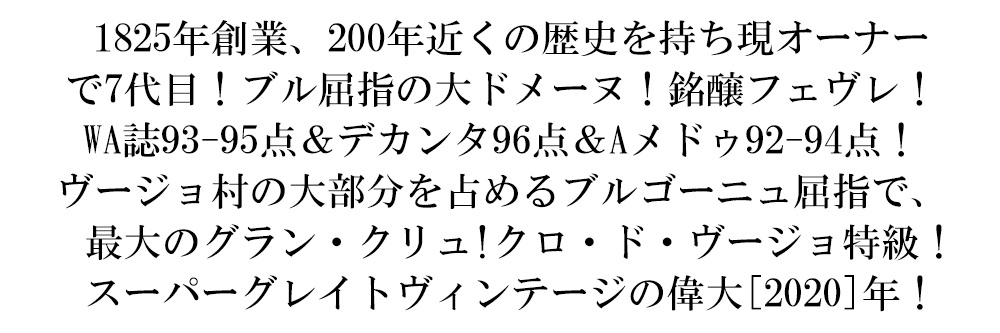 クロ ド ヴージョ グラン クリュ 特級 2020 年 ドメーヌ フェヴレ元詰 正規品<br>Clos de Vougeot Grand Cru 2020 Domaine Faiveley AOC Clos Vougeot Grand Cru