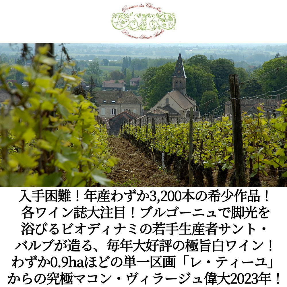 【商品説明】ブルゴーニュ辛口白ワイン愛好家大注目!自然派ビオディナミ(ビオロジック)愛好家大注目!年産わずか3,200本のみ!しかもスーパーグレイトヴィンテージ[2023]年もの!ブルゴーニュ委員会による評価は『ワインは良質で、凝縮感とバランスに優れている。極端な暑さに見舞われた年であったというのに、新鮮な果実のアロマと躍動感が明るい未来を感じさせる、驚くべきヴィンテージとなった。白ワインは、その丸み、滑らかさ、そして複雑さで際立っている。リッチで非常に表情豊か、果実のアロマが過度にならずに存在感を示している。味わいでは、みずみずしい果実味とバランスの良さが生き生きと持続する。』と大絶賛!アシェット・ガイド誌2024年版でも18/20点を付けるスーパーグレイトヴィンテージ[2023]年もので遂に少量入荷!造り手は、アシェット・ガイド誌でも星付大注目!ベタンヌ&ドゥソーヴ2015年版でも星付大注目!リアルワインガイド誌他ワイン誌大注目!ブルゴーニュで脚光を浴びるビオディナミの若手生産者サント・バルブ!ブルゴーニュワイン専門誌「bourgogne Aujourd'hul」で大きく取り上げられ今やマコンの大御所を抑えてトップ生産者の1人に躍り出たジャン・マリー・シャラン氏による上位のマコンの白ワインの名称であり、白ワインのみの高級AOC規格である“マコン・ヴィラージュ”AOC!ワイン評論家のヒュー・ジョンソン氏は「上位のマコンワインの包括名称!マコン・リュニ、ラ・ロッシュ、ヴィーヌズなど村名自体を使うこともある」と絶賛し、★★~★★★3つ星!ずばり毎年大好評のサント・バルブの究極マコン・ヴィラージュ!しかもわずか0.9haほどの単一区画「レ・ティーユ」!粘土石灰質土壌の平均樹齢45年のシャルドネ100%をステンレスタンクで7ヶ月熟成で造られる極旨辛口白ワイン!前VTでリアルワインガイド87号で「そしてこのワイン以降は別のアロマと味わいとなる。 それはフローラルでフルーティな味わいから、フローラルなんだけど締まりがあり、フルーティさよりも大地系の風味が加わる本格派のものとなるから。 ちなみにこのキュヴェは前銘柄と次以降のワインのちょうど中間に位置する風味であり、22年も同様。 いつもクオリティが高い。」と90+~91点(飲み頃予想 今~2045年)と大注目!青みを帯びた黄金色!ピーチ、アプリコット、レモン、パイナップルのアロマにかすかにトーストのニュアンスが感じられる!味わいは伸びがありふくよか!もぎたての果実のジューシーでフレッシュな余韻が続く圧巻の極旨ブルゴーニュ辛口白ワイン!銘醸サント・バルブの待望レ・ティーユのスーパーグレイトヴィンテージ[2023]年ものが限定で少量入荷!