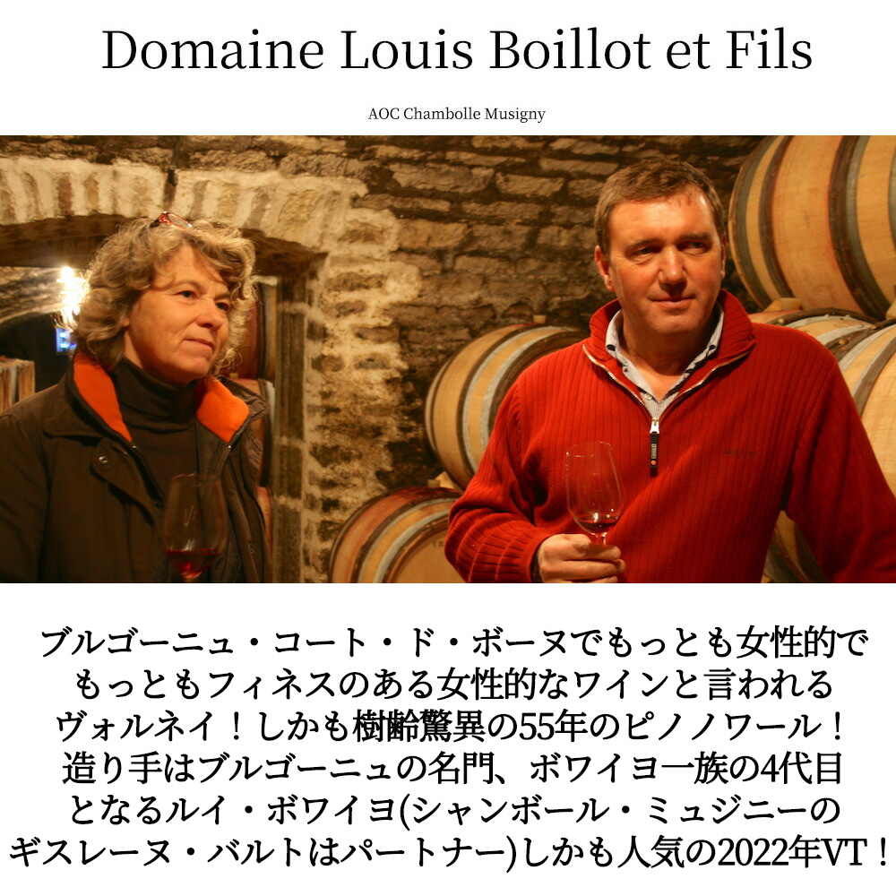 【商品説明】高級ヴォルネイ愛好家垂涎!ブルゴーニュ辛口赤ワイン愛好家大注目!高級レストラン様に大人気!しかもコート・ド・ボーヌでもっとも女性的でもっともフィネスのある女性的なワインと言われるヴォルネイ!ワイン評論家のヒュー・ジョンソン氏をして「コート・ド・ボーヌで最良の赤となることが多い。色は濃くなく、重くもなく、しかし構成のしっかりしたもので、絹のようにやわらかい。」と絶賛! 造り手は名門ボワイヨ一族。祖父アンリより代々受け継いだ素晴らしい畑の樹齢は最高90年と非常に高い。その古樹の複雑さや凝縮された旨みを最大限に引き出したワインを産み出している。本当のブルゴーニュ愛好家が今飲むべきドメーヌ。ルイ・ボワイヨについては『ブルゴーニュの名門、ボワイヨ一族の4代目となるルイ・ボワイヨは、遅咲きの新星だ。1978年に醸造学校を卒業後、当時注目を集めつつあった父のドメーヌ、ルシアン・ボワイヨの下でワインを造り始めた。しかしその後、公私ともに長年のパートナーとなるシャンボール・ミュジニーのギスレーヌ・バルトと出会い、彼女のワイン造りに関わる中で、彼が求めるワインと父が求めるワインの方向性の違いに気付いた。自らが納得できるワインを求め、遂にルイが独立を果たしたのは2003年のこと。祖父のアンリ・ボワイヨから受け継がれたヴォルネイ、そして父親から相続したジュヴレ・シャンベルタンなど、数々の素晴らしい畑を手に、シャンボール・ミュジニーでギスレーヌ・バルトと共有するセラーに移ったのである。このような経緯から、ルイ・ボワイヨは小さな個人ドメーヌとしては珍しく、コート・ド・ニュイとコート・ド・ボーヌの両方に畑を持つ。合計7haの畑の平均樹齢は約55年と高く、中には最高樹齢が100年に達する区画も含まれる。ルイは代々受け継いできたこれらの古樹を、彼のワインを特徴づけるものとして大切に守っている。独立当時から変わらずルイが理想とするのは、エレガントで洗練されたワインだが、難解なワインは求めていない。ブドウが育まれたテロワールと透明感あるピュアな果実を備えた、無条件に飲んで美味しいと思えるワインを目ざしているのだ。事実、ルイ・ボワイヨのワインには、優しさ、穏やかさ、そして幾重にも広がるグラデーションのような古樹特有の深みが存在する。長い年月をかけて地中深くに張ったブドウの根が、彼のワインにブルゴーニュのピノ・ノワールの真の魅力をもたらすのである。設立間もなく、彼はブルゴーニュ新時代の中心的存在として注目を浴びる生産者の一人となった。既に確固たる哲学を持ち、豊かな経験も備えていた彼とっては、当然の結果かもしれない。「今や一流のドメーヌ」と称えられるルイ・ボワイヨは、ブルゴーニュ評論の権威クライヴ・コーツから、ロベール・グロフィエ、ユベール・リニエ、クリストフ・ペロミノなど、スター生産者に並んで1ッ星評価を獲得。更に、世界のワイン情報が集められた『ワイン・レポート』では、「最も進化の早い10の生産者」の第一位に輝いている。』 このヴォルネイ・レ・グラン・ポワゾ[2022]年で、ワインアドヴォケイト誌は2022年がまだですが2021年91点、2020年91点、2019年91点連続で獲得!アランメドゥ・バーガウンドでもこの偉大な2022年で89-92点で大注目!絶賛コメントは『これもかなりフレッシュで風通しが良いが、プラム、スミレ、より明白な土の影響といった濃い果実味がある。焦点の定まった正確なミディアムボディの味わいにはややボリューム感があり、美しくバランスの取れた印象的で複雑なフィニッシュで締めくくられる。このレベルにしては素晴らしい。Outstanding 2030年+- 89-92点』とハートマーク付のOutstandingのコメント付で大絶賛!&ジャスパーモリス驚異の91-93点&ヴィノス誌90-92点獲得! 樹齢約55年。所有区画はポマールとの境界に位置する畑の中腹を占める。最高のワインができると言われるミルランダージュを起こす樹が多く、凝縮した小さな粒のブドウが得られる。 黒い果実やスパイスの落ち着いた香り。タンニンは豊かでメリハリがきいてバランスがよく、しっかりとした骨格を持つ味わい。果実味のボリュームよりもエキスの濃さがうかがえ、後半に掛けての集中力や密度が余韻へと長く続く男性的なヴォルネイが正規品の素晴らしい状態でしかもグレイトヴィンテージで限定少量!
