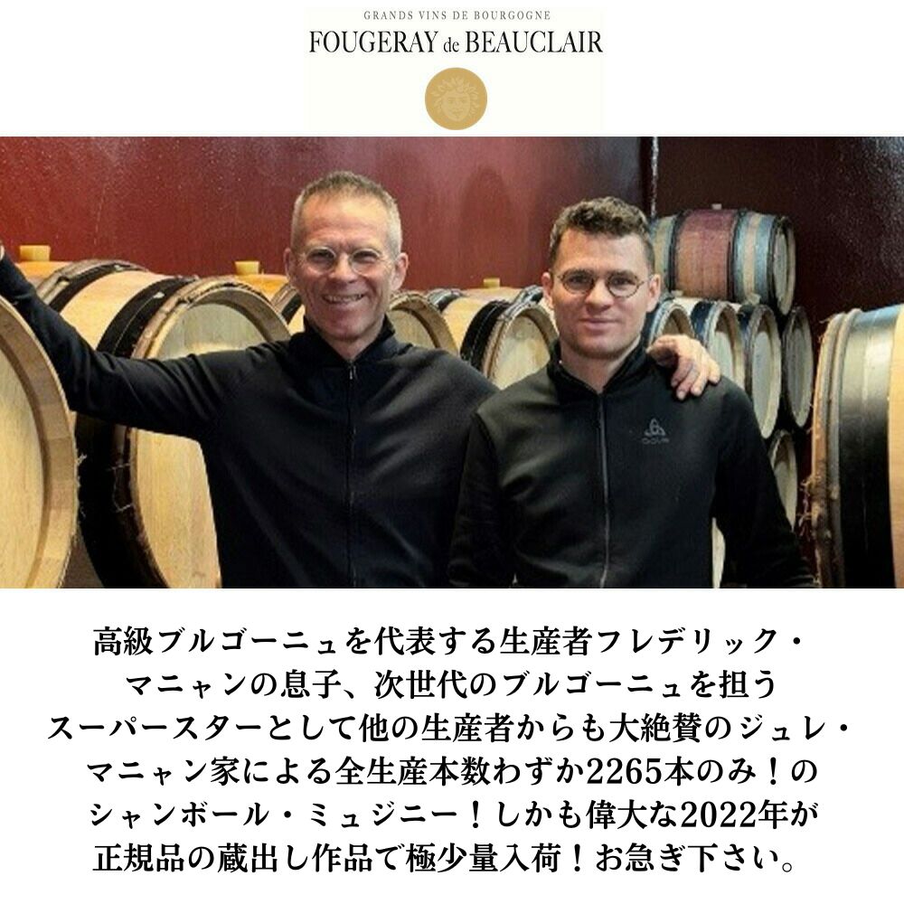 【商品名】シャンボール・ミュジニー・(ヴィエイユ・ヴィーニュ)[2022]年・蔵出し作品・ドメーヌ・フージュレイ・ド・ボークレール元詰(ジュレ・マニャン家=ブルゴーニュを代表する生産者フレデリック・マニャンの息子の新進ドメーヌ)・自然派・ビオディナミ(エコセール認証&太陰有機法(Bio-Lunaire))平均樹齢55年のVV・ヴォーヌロマネ村の最高峰ドメーヌからの使用樽14ヶ月熟成・AOC・シャンボール・ミュジニー・オーク樽50%&アンフォラ50%で14ヶ月熟成・重厚ボトル・年産2265本のみ【英名】Chambolle Musigny 2022 Domaine Fougeray de Beauclair (F&J Magnien ) AOC Chambolle Musigny BIO (2881Btl)