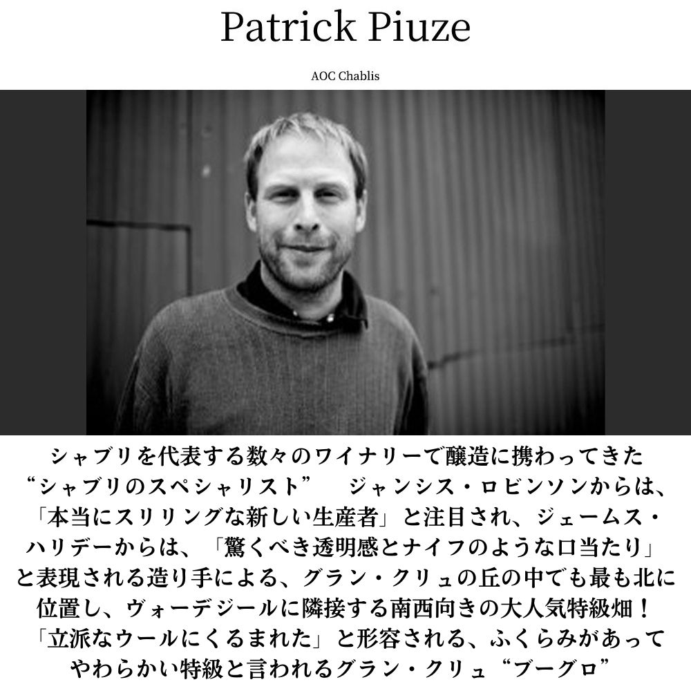 【商品名】シャブリ・グラン・クリュ・特級・ブーグロ[2023]年・パトリック・ピウズ・(シャブリを代表する数々のワイナリーで醸造に携わってきた「シャブリのスペシャリスト」)・AOC・シャブリ・特級・セレイン川の右岸、南向きの畑の樹齢40年のVV&フレンチオーク樽のバリック100%発酵&11ヶ月熟成・ロウ封印キャップ・ワインアドヴォケイト誌驚異の92+点&ティムアトキン驚異の93点【英名】Chablis Grand Cru Bougros 2023 Patrick Piuze AOC Chablis Grand Cru