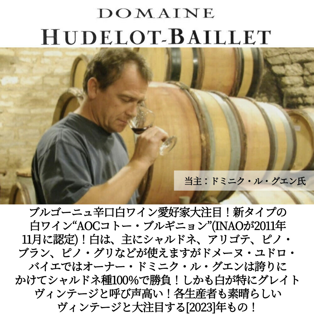 【商品説明】入手困難!ブルゴーニュ辛口白ワイン愛好家大注目!新タイプの白ワイン“AOCコトー・ブルギニョン”!AOCコトー・ブルギニョンはINAOが2011年11月に認定し、2011年ヴィンテージから適用された、ブルゴーニュ・グラン・オーディネールに代わりブルゴーニュを代表するワインとして位置づけされたAOCワイン!しかも待望のスーパーグレイトヴィンテージ[2023]年(アシェットガイド誌2025年版ではこのブルゴーニュの白に17/20点の高評価!の大人気の2023年もの)! 白は、主にシャルドネ、アリゴテ、ピノ・ブラン、ピノ・グリなどが使われます。ブレンド比率の規定はなく、生産者が自由にブレンドできるのが特徴です。使用品種の割合に規定がないため、ブレンドの自由度が高く、ヴィンテージ(作柄)の良かった産地のブドウを中心に使えるのが強み!しかしドメーヌ・ユドロ・バイエではオーナー・ドミニク・ル・グエン氏は誇りにかけてシャルドネ種100%で勝負!しかも白が特にグレイトヴィンテージと呼び声高い!各生産者も素晴らしいヴィンテージと大注目する[2023]年もの! 造り手は、リアルワインガイド誌で、「シャンボールの4巨頭といっても差し支えないかも」と言わしめた超人気生産者!ドメーヌ・ユドロ・バイエ!の究極コトー・ブルギニヨン・ブラン!この“レ・ブラック・チェアーズ”ブランは、ジイィ・レ・シトー村産のシャルドネ100%。わずか0.18ha。樹齢約30年。収量は60hl/ha。ステンレスタンクでアルコール発酵後、228リットルと450リットルの3回使用樽で12ヶ月間熟成。清澄は行わず、軽くフィルターをかけてビン詰め。生産者収益金の一部は、「Comite Departemental Handisport de Cote d'Or(コート・ドール県ハンディスポーツ部門委員会)」および「Association Quad Rugby avec Corentin et les Black Chairs(コランタンとレ・ブラック・チェアーズによる車いすラグビー協会)」に寄付されています。 丸みのある柔らかさとフレッシュなフルーツの味わい、程良く切れのある酸とのバランスのよく取れた辛口白ワイン、しかも新規格の大人気グレイトヴィンテージ2023年が現地のセラー数ヶ月前の蔵出し作品で限定少量入荷!