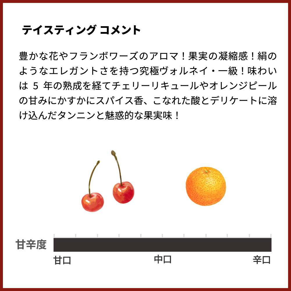 【商品説明】入手困難!高級ブルゴーニュ辛口赤ワイン愛好家大注目!しかも待望のスーパーグレイトヴィンテージ[2022]年もの (ワインアドヴォケイト誌はブルゴーニュのコート・ド・ボーヌの赤に「史上最高のヴィンテージ!のひとつ!驚異の95点&RVF誌2025年版98点のスーパーグレイトヴィンテージ) の高評価! しかもコート・ド・ボーヌでもっともフィネスのある、ビロードのように滑らかな女性的な赤ワインとして有名なヴォルネイ!ワイン評論家のヒュー・ジョンソン氏に「コート・ド・ボーヌで最良の赤「コート・ド・ボーヌで最良の赤となることが多い。色は濃くなく、重くもなく、しかし構成のしっかりしたもので、絹のようにやわらかい。」と絶賛させたヴォルネイAOC! しかも造り手は、ロバート・パーカー4つ星!ゴーミヨ誌5つ星!ワインプレス誌軒並み高評価!のブシャール家の大人気でしかも貴重なドメーヌもの!しかも1731年創業の2世紀を超える歴史と130ha以上の自社所有畑を有するドメーヌ&メゾンのブシャール・ペール・エ・フィス社がなんと!1775年に初めて購入した記念碑ともいうべき一級畑“カイユレ”!昔から少なくとも地元では「カイユレを飲まずしてヴォルネを語るなかれ」と言われてきた有名銘醸畑!しかもその中でもつねに名が出るのがブシャール・ペール・エ・フィスのこのプルミエ・クリュ・カイユレのアンシェンヌ・キュヴェ・カルノとプスドールクロ・デ・ソワサント・ウーヴレ!などの人気キュヴェ! この一級・カイユレ・アンシェンヌ・キュヴェ・カルノ[2022]年で、ジェームス・サックリング驚異の95点でコメントは「このアペラシオンの花のような美しさもあるが、より赤い果実と熟したブラックベリーの風味がある。たっぷりとしたコクのあるボディは、上質なタンニンとビスケットのタッチに支えられている。長くしなやかなフィニッシュは、さらに飲みたいと思わせる。ブシャール家が1775年に購入した最初の畑。斜面の中央に位置し、粘土質の土壌は浅い。有機栽培のブドウを使用。」と大注目! さらにデカンタ95点でコメントは「ヴォルネイのカイユレの区画は、石灰岩の薄い土壌と表面的な性質のため、2022年に初めて収穫されたピノである。ブラックベリーと桑の実の魅力的なアロマに、ツゲ、月桂樹、牡丹のニュアンス。テクスチャーはしなやかでヴェルヴェットのようで、飲み応えのある凝縮感と密度がある。ブシャールのチームは、日焼けでしなびたブドウ「フィギュエ」を厳しく選別している。テクニカル・ディレクターのフレデリック・ウェーバーは、成功するかどうかは「歯ごたえを保つ」ことにかかっていると言う。今年試飲したこの畑の1962年はまだフレッシュだった。」! 今やパーカーを凌駕する勢いのアラン・メドゥのバーガウンド・ドット・コムでハートマーク付きで驚異の92~95点の高評価!しかもSweet spot Outstandingの最高評価!のコメント付きで「ブラックチェリーのアロマはリキュールのようで、花やスパイスのニュアンスがある。撫でるような、しかし力強く、美しく細部まで行き届いたミドルの風味は、ミネラルとドライなエキスに溢れ、埃っぽく、程よく渋く、熟成に耐えうるフィニッシュへと続く。口当たりはまさにピュア・シルク。」と大絶賛! ティム・アトキン94点でコメントは「フレデリック・ウェーバーは、岩盤のすぐ上にある表土が痩せていることもあって、3日間でアルコール度数を1度上げるポテンシャルがあると語った。しかし、フレッシュさがあり、過熟感はない。ミディアムボディを穏やかに持ち上げる酸が口中を這い回り、砕いた砂利のニュアンスもあり、ミネラルの活力も感じられる。完璧に熟したブルーベリーが甘いクリームとスミレと出会い、持続性のあるフィニッシュを迎える。」と高評価! 豊かな花やフランボワーズのアロマ!果実の凝縮感!絹のようなエレガントさを持つ究極ヴォルネイ・一級!味わいは5年の熟成を経てチェリーリキュールやオレンジピールの甘みにかすかにスパイス香、こなれた酸とデリケートに溶け込んだタンニンと魅惑的な果実味を表現する究極ヴォルネイ・一級・カイユレのスーパーグレイトヴィンテージ[2022]年が蔵出し品の正規品で限定少量入荷!