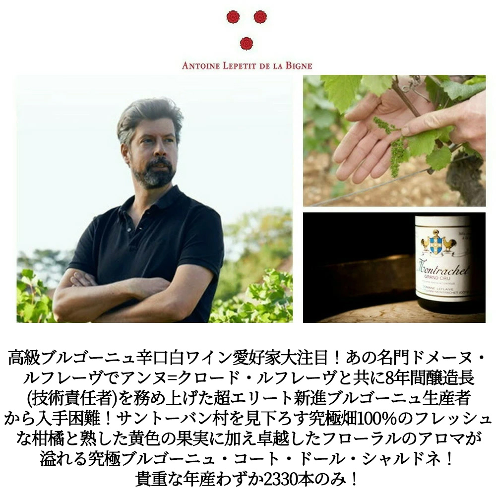 【商品名】ブルゴーニュ・コート・ドール・シャルドネ[2023]年・超限定作品・アントワーヌ・ルプティ・ド・ラ・ビーニュ(名門ドメーヌ・ルフレーヴの元醸造長)(3回目のグレイトヴィンテージ)・世界的に超入手困難ワイン・サントーバン村100%・自然派・ビオディナミ(ビオディナミカレンダーの果実の日に瓶詰め)・樽醗酵&樽熟成・ロウ封印キャップ(ボトルにナンバー入り=年産わずか2330本のみ)【英名】Bourgogne Cote d'Or Chardonnay 2023 Antoine Lepetit de la Bigne (La Pierre Ronde) AOC Bourgogne Cote d'Or Chardonnay