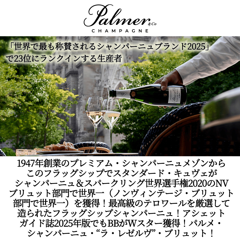 【商品説明】人気シャンパーニュ辛口愛好家大注目!このフラッグシップでスタンダード・キュヴェがシャンパーニュ&スパークリング世界選手権2020で「パルメ・ブリュット・レゼルヴ」が「World Champion Classic NV Brut 」(ノンヴィンテージ・ブリュット部門で世界一)を獲得。また、英国のアルコール飲料専門誌「ドリンクス・インターナショナル」が選ぶ「世界で最も称賛されるシャンパーニュ・ブランド2021」にてこのパルメが全シャンパーニュ生産者4,500超の中で23位に選ばれており、今もっとも勢いのあるシャンパーニュ生産者。 (フラッグシップの「パルメ・ラ・レゼルヴ」がシャンパーニュ&スパークリングワイン世界選手権2020で「World Champion Classic NV Brut」を獲得し、世界一のNVシャンパーニュに選ばれた他、「世界で最も称賛されるシャンパーニュブランド2025(The World’s Most Admired Champagne Brands 2025)」において世界で23位にランクインするなど各国でその品質の高さを評価されています) パルメの哲学は「時間」を尊重すること。スタンダードキュヴェであるラ・レゼルヴでさえ最低4年の瓶内熟成を行います。35年以上続くソレラシステムによるリザーヴワインの貯蔵、20年以上の長期熟成を前提としたミレジムシャンパーニュなど、ブランドのDNAを受け継いだ最高のシャンパーニュを造るためには時間をかけることを厭いません。長期熟成によりもたらされる複雑な熟成感と、まるで時をかけてきたかのようなフレッシュさが共存する、時代を超えて受け継がれるシャンパーニュです。 また、『メドック格付3級Ch.パルメとは全く関係性はありません!ただ…Ch.パルメが許可をしたのは品質の良さからだった!?といわれています。“シャンパーニュ”パルメの品質の高さに当時のCh.パルメのオーナーも納得し、シャンパーニュ名としての使用に関してお墨付きをもらったという逸話があります。ちなみに…“シャンパーニュ”パルメの由来は、自分たちが造るシャンパーニュが世界的ブランドになったときに、シンプルで覚えやすく愛される名前が必要だと考え、当時シャンパーニュの都市ランスで大人気だったイギリスの有名ビスケットメーカーのハントリー&パーマー (Huntley & Palmer) からPalmer (パルメ) を取って、“シャンパーニュ“の「パルメ」が誕生したとも言われています。』 1947年創業のプレミアム・シャンパーニュメゾン。モンターニュ・ド・ランスの7人のシャンパーニュ生産者たちが集まり、世界に名を轟かすシャンパーニュブランドを創り上げようという想いで設立されました。現在、モンターニュ・ド・ランス地域に広がる200ha以上のグラン・クリュとプルミエ・クリュのブドウを主体に、非常に洗練されたシャンパーニュを生産しています。フラッグシップの「パルメ ラ・レゼルヴ」がシャンパーニュ&スパークリングワイン世界選手権2020で「World Champion Classic NV Brut」を獲得し、世界一のNVシャンパーニュに選ばれた他、「世界で最も称賛されるシャンパーニュブランド2025(The World’s Most Admired Champagne Brands 2025)」において世界で23位にランクインするなど各国でその品質の高さを評価されています。 このパルメ・シャンパーニュ・“ラ・レゼルヴ”・ブリュットでファルスタッフ誌驚異93点獲得絶賛コメントは『淡い黄金色に銀色の輝きを帯びた、非常に繊細な泡立ち。新鮮なハーブのほのかな香り、甘く煮詰めたオレンジの皮のニュアンス、新鮮なリンゴ、マンゴーのほのかな香り。中程度のボディ、美しい白石果実の風味、フレッシュな構造、リンゴの余韻、バランスの取れた味わい、ミネラルとレモンの余韻、ほのかなグレープフルーツのニュアンス、親しみやすく、多用途に使える、長い余韻。93点』とコメント! アシェットガイド誌2025年版Wスター獲得!最高級のテロワールを厳選して造られたフラッグシップシャンパーニュ。モンターニュ・ド・ランスのプルミエ・クリュとグラン・クリュが主体で、それぞれの特徴が表れています。リザーヴワインが、稀に見る凝縮感と熟成感をもたらしています。時代を超えて受け継がれるパルメ・スタイルの象徴です。香りは非常にクリーンで、柑橘系果実、洋梨、アプリコット、僅かにヘーゼルナッツやペストリーを思わせるバターの控え目なニュアンスが、まるで上質なアロマのパレットを広げた様に表現されています。